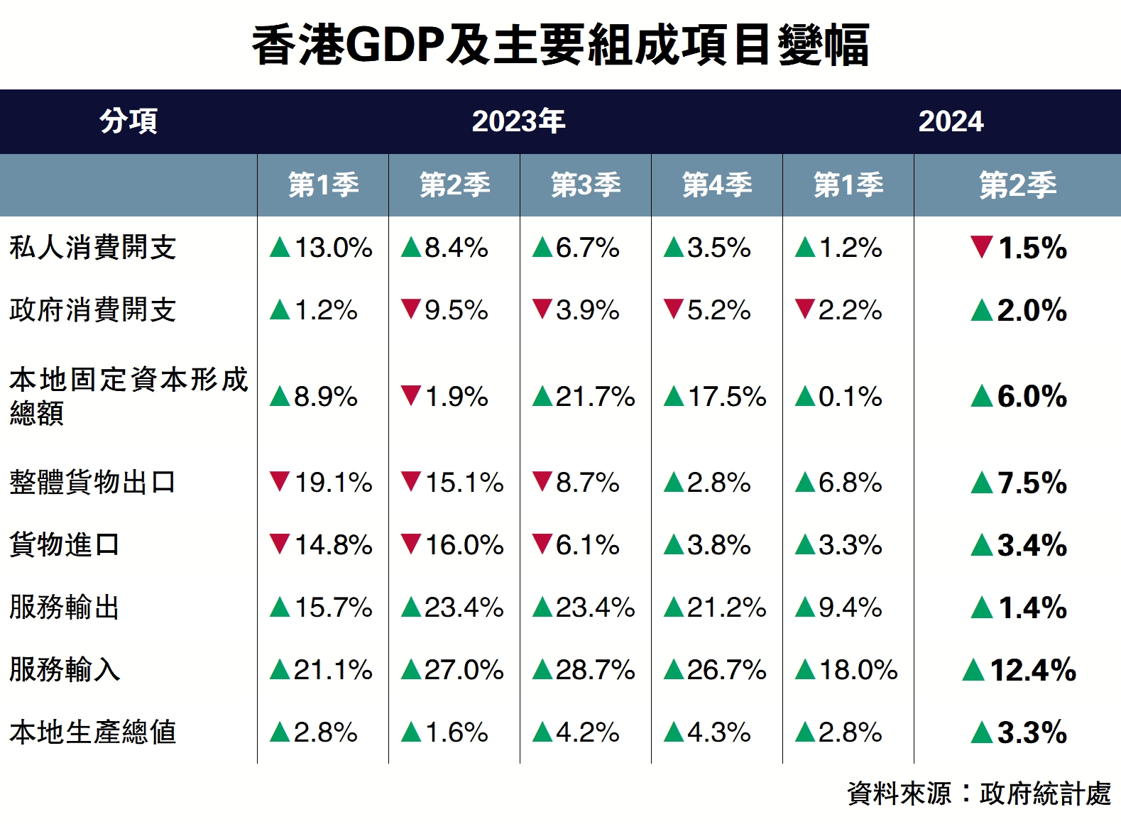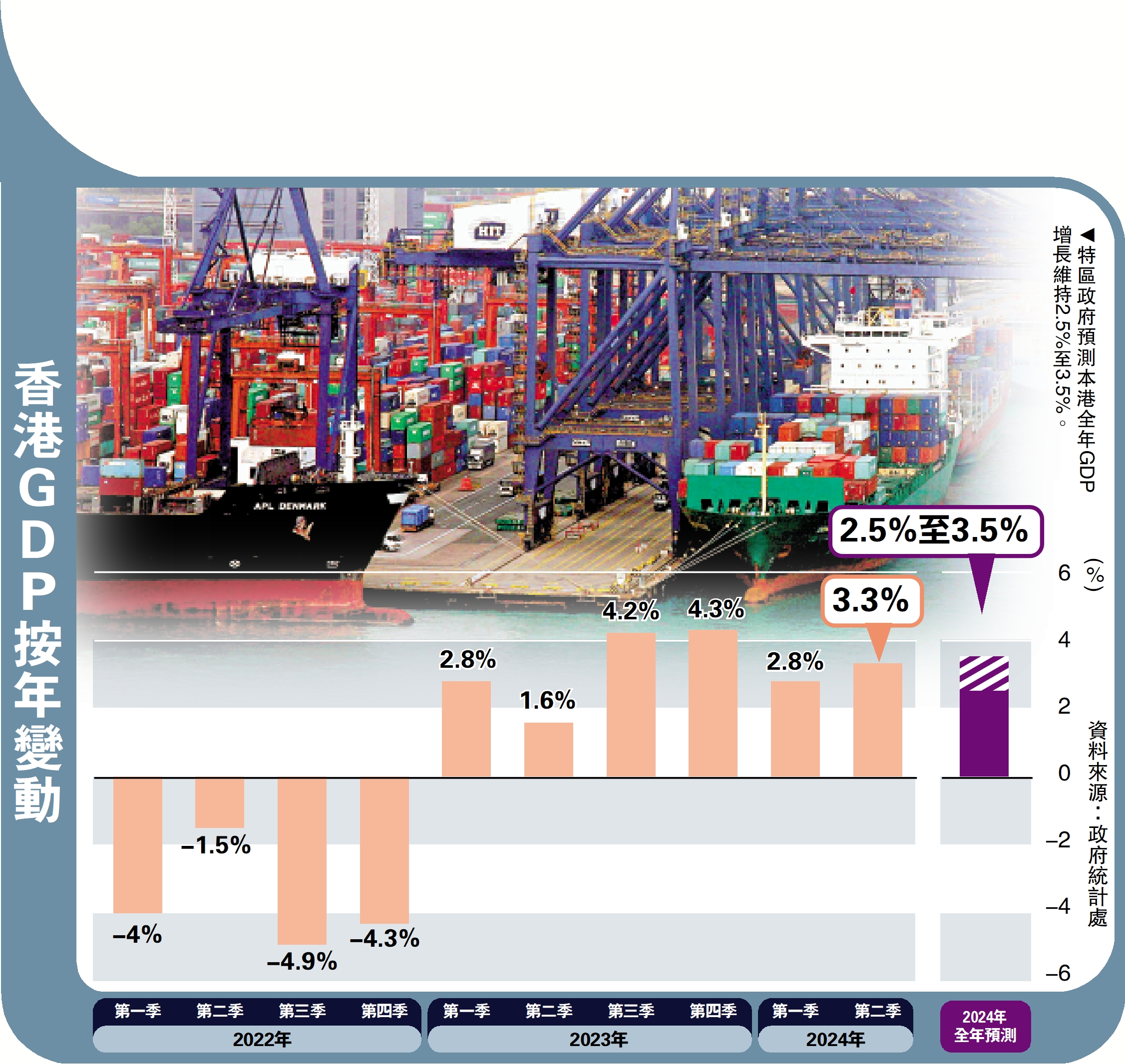 (大公報記者 李信)受惠貨物出口強勁增長,香港第二季本地生產總值(GDP)按年升3.3%,好過市場預期,且連續第六季錄得增長。展望未來,特區政府表示,整體經濟在今年餘下時間應繼續增長,但地緣政治緊張局勢和環球經濟及利率前景等多項因素,或會為不同方面帶來不確定性。