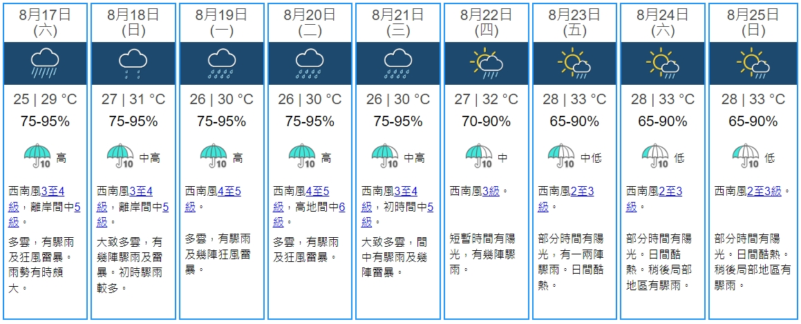 天文台表示,與廣闊低壓槽相關的強雷雨區正持續影響珠江口一帶,是否需要發出紅色暴雨警告信號,要視乎該雷雨區的發展,呼籲市民提高警惕,並留意最新天氣消息。天文台預測今日初時雨勢有時頗大,日間最高氣溫約29度。吹和緩西南風,離岸風勢間中清勁,未來兩三日仍有驟雨及幾陣狂風雷暴。