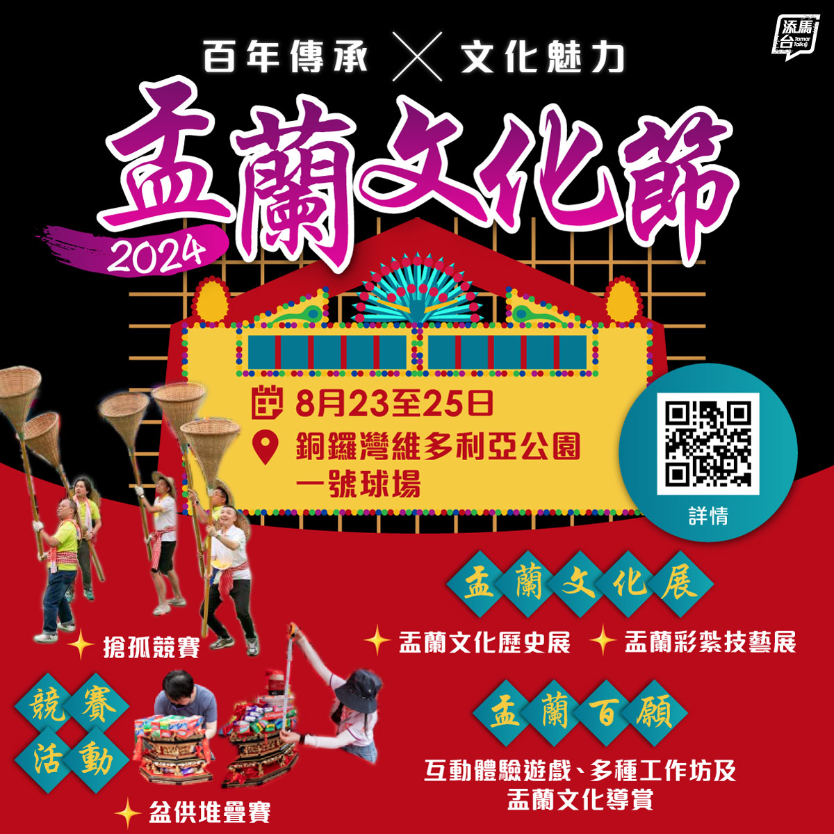 今年盂蘭文化節於8月23至25日在銅鑼灣維園舉行,活動豐富多彩,包括展現慈善濟貧的搶孤競賽及弘揚孝道的盆供堆疊賽,讓年輕人從比賽中體驗傳統文化和展示活力,亦設有「盂蘭百願」互動體驗遊戲、盂蘭文化展覽及文化導賞,以及盂蘭紮作摺紙製作、潮洲粿品製作、手鉤花盂蘭文創、金榜題名書寫體驗、盂蘭工夫茶等工作坊,讓大家從多方面了解盂蘭文化特色。