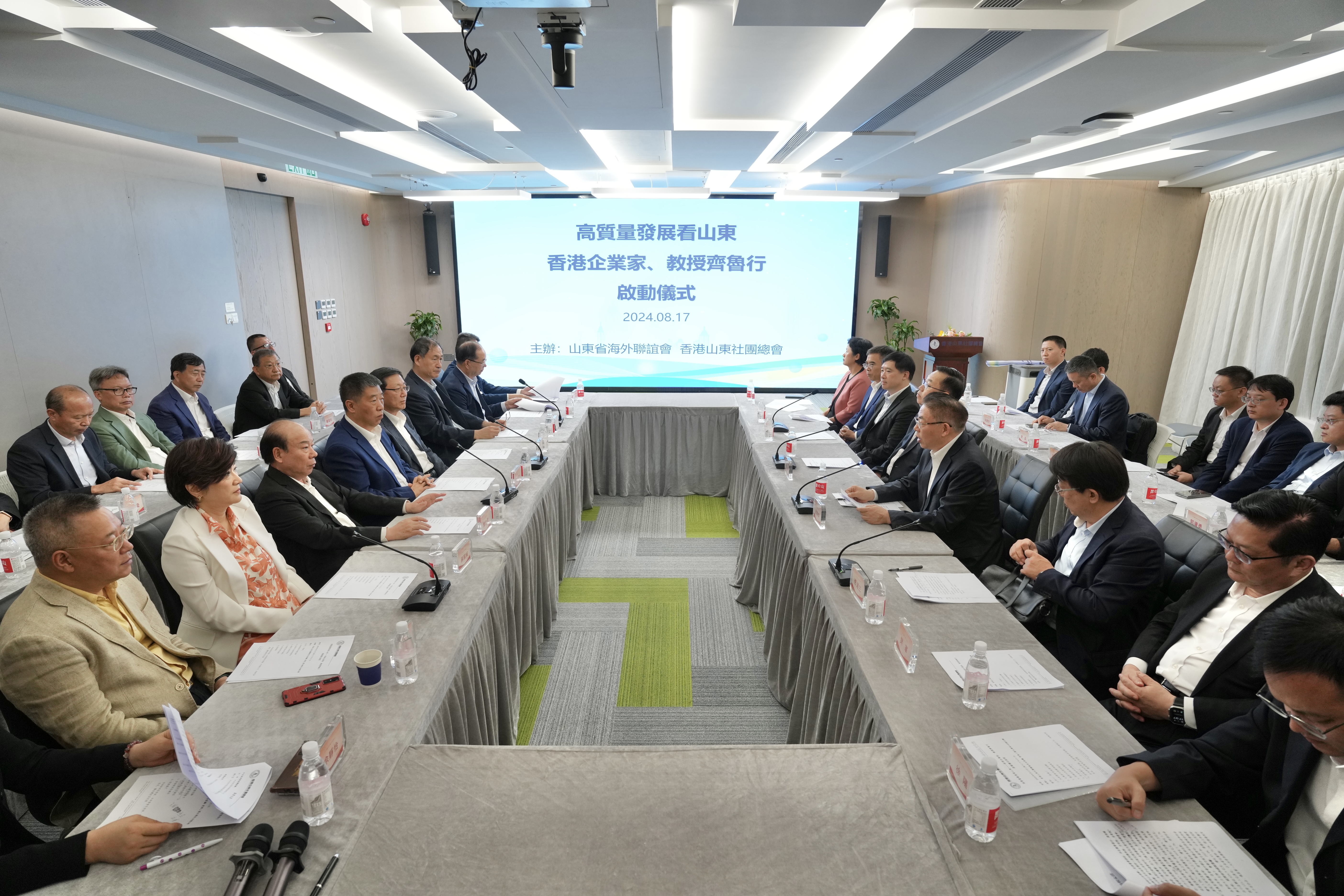 (大公報記者 劉遠、李信)由山東省海外聯誼會、香港山東社團總會聯合主辦的「高品質發展看山東──香港企業家、教授齊魯行」今日(17日)在港舉行啟動禮,共約100位香港工商界人士、立法會議員、專業人士及高校前沿學科的教授,將於8月28至31日前赴山東多地考察。山東省委常委、統戰部部長及省海外聯誼會會長徐海榮今出席啟動禮時表示,魯港交流日益密切,各領域的合作成果豐碩,希望與會者充分發揮人脈資源和商業網絡的優勢,推動魯港貿易和產業合作提質升級。