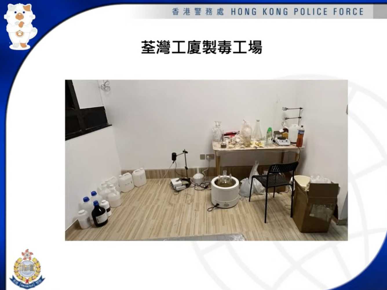 前日毒品調查科人員突擊搜查涉事的荃灣工廈單位,搗破單位內的製毒工場,檢獲約2公斤K仔及6公斤製毒原材料,市值共約96萬元。現場亦有大量樽裝化學品,包括乙醇和丙醇等,以及一些電子磅、電磁爐、攪拌器和煲等製毒工具。警方經過初步調查,涉案單位內除了半製成品及未經包裝的K仔外,其他大部分材料都儲存於膠樽及膠袋內,相信涉案毒品並未流出市面。警方強調會繼續追查毒品原材料來源,以及販毒集團的其他成員。