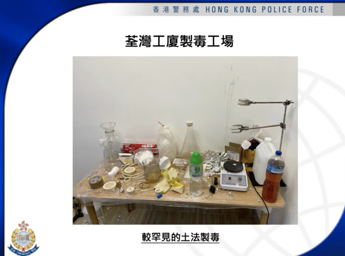 此外,警方指出,案中搜出大量腐蝕性物質,這些化學品在儲存和加熱過程中隨時會引發火警,並有爆炸的風險,販毒集團的做法完全罔顧市民安全。警方強調今次案中涉及的土法製毒手法比較罕見,警方會留意相關趨勢及情況,並會適時進行打擊。