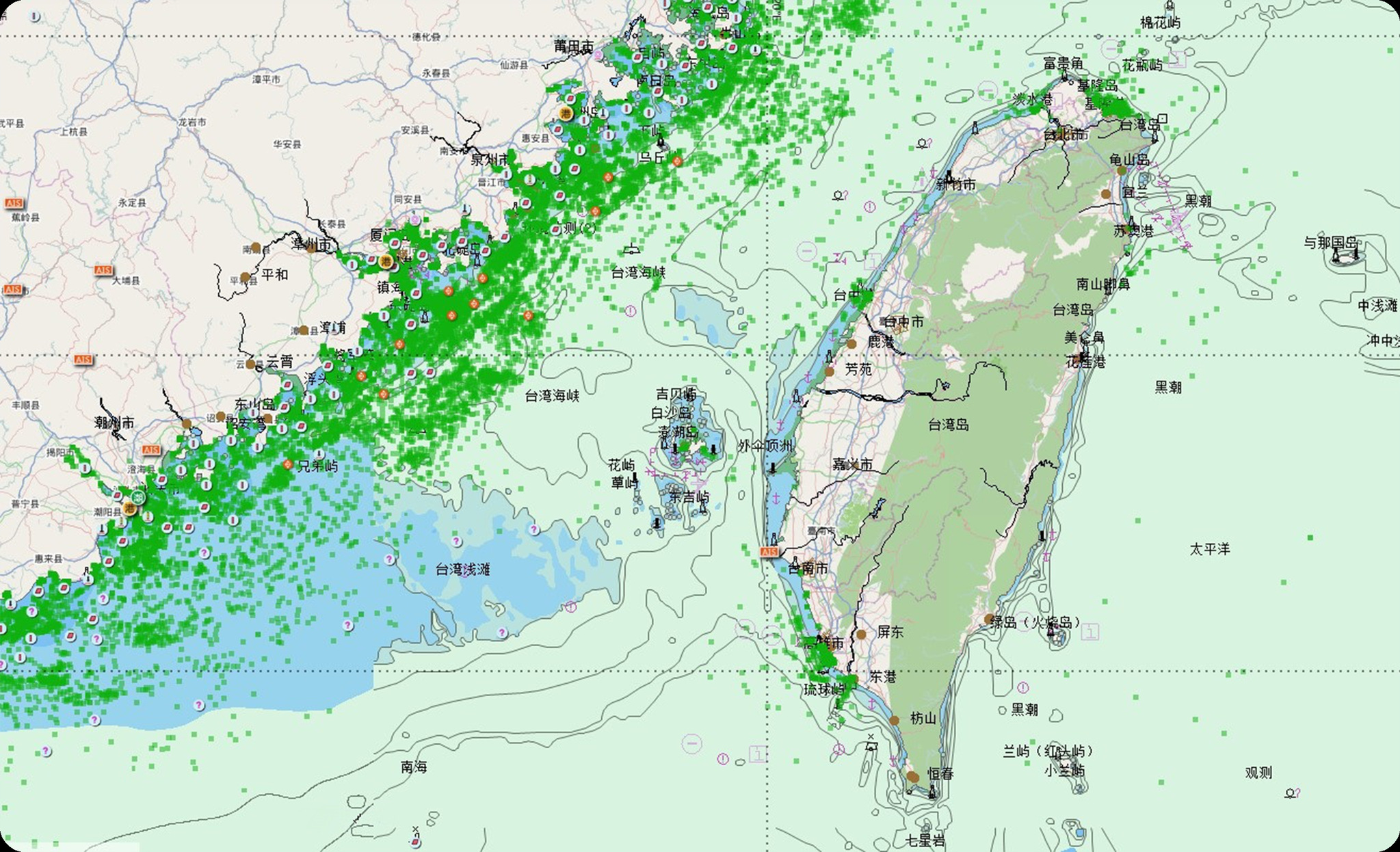 從圖上可以看到,要到達台灣島西岸,大多數船隻都需要穿過台灣海峽中部海域。
