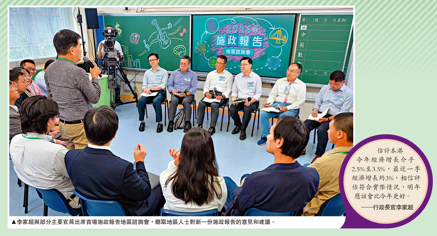 昨日的諮詢會有約20名主要官員一同出席。李家超強調,市民的寶貴意見有助他撰寫施政報告時更深入理解社會和地區問題,讓政策更好回應市民所需。他和團隊會認真研究市民的建議,繼續創新求變,解決市民的問題,團結社會各界為香港拚經濟、謀發展,為市民做實事。