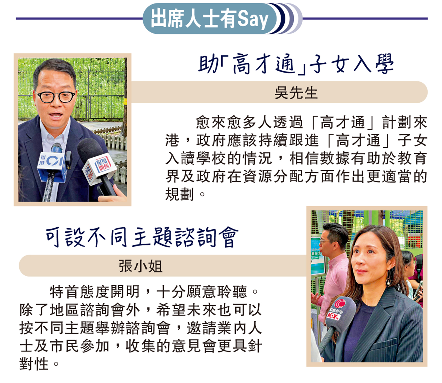 有從事藝術工作的市民則指出,香港藝術人才需求殷切,本地的培訓較少,盼政府可以多提供培訓機會。亦有市民關注特區政府如何加強本地文化人才培訓,並認為可以與內地合作參與文創項目。