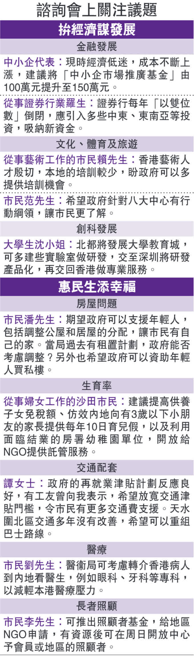 有大埔市民指出,東鐵綫研究興建的白石角車站十年後才完工,希望提速提效令配套可以追上。亦有大埔市民建議政府強化跨境醫療服務,讓港人可選擇到內地就醫,減輕本港醫療壓力。