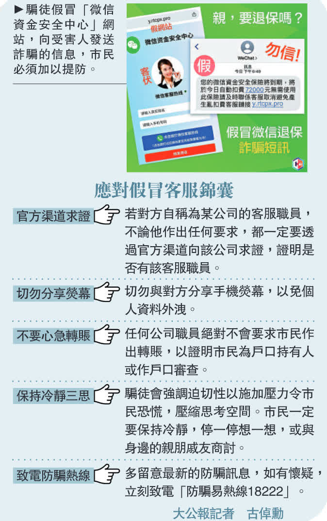 (大公報記者 古倬勳)騙徒手法層出不窮,最近更變招透過假冒微信等客服,誘騙市民提交保證金取消所謂「保險計劃」騙財,市民時刻需要提防免墮陷阱。警方今年首七個月共錄得2716宗假冒客服騙案,涉款逾5.8億元,7月的宗數已是今年上半年的七成。