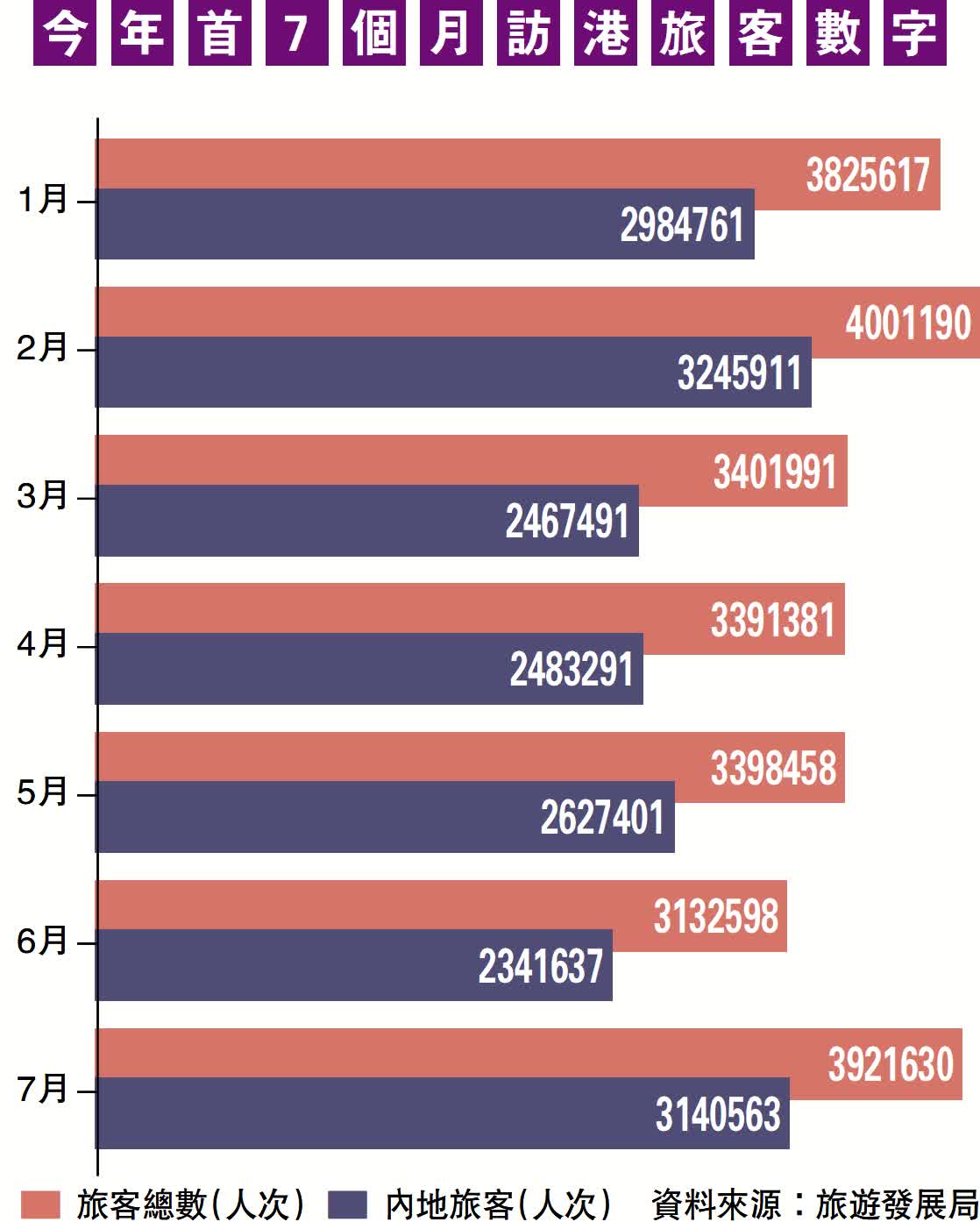 旅發局早前公布,7月訪港旅客的初步數字是392萬人次,按月升25%,當中內地旅客有314萬人次,按月升34%。總計今年1至7月,共錄得約2500萬人次訪港,按年增加52%,其中內地旅客佔1930萬人次,非內地旅客錄得580萬人次,按年分別多47%及71%。