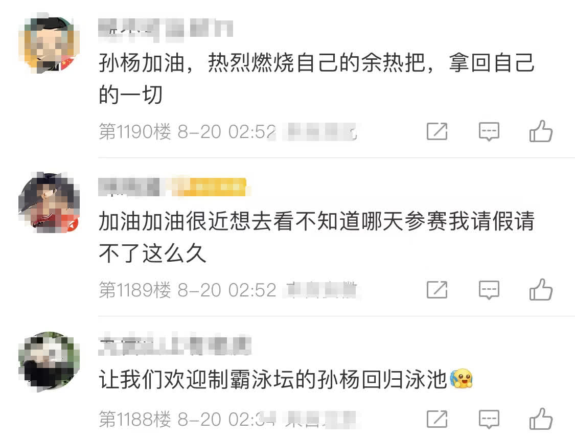 孫楊重返賽場的消息一出,很快引起熱議,不少網友紛紛為他送上祝福,「不是每個人都有這樣的勇氣,孫楊沒有辜負他熱愛的游泳」「真沒想到還能再次見到賽場上的孫楊」「王者歸來!孫楊加油」。