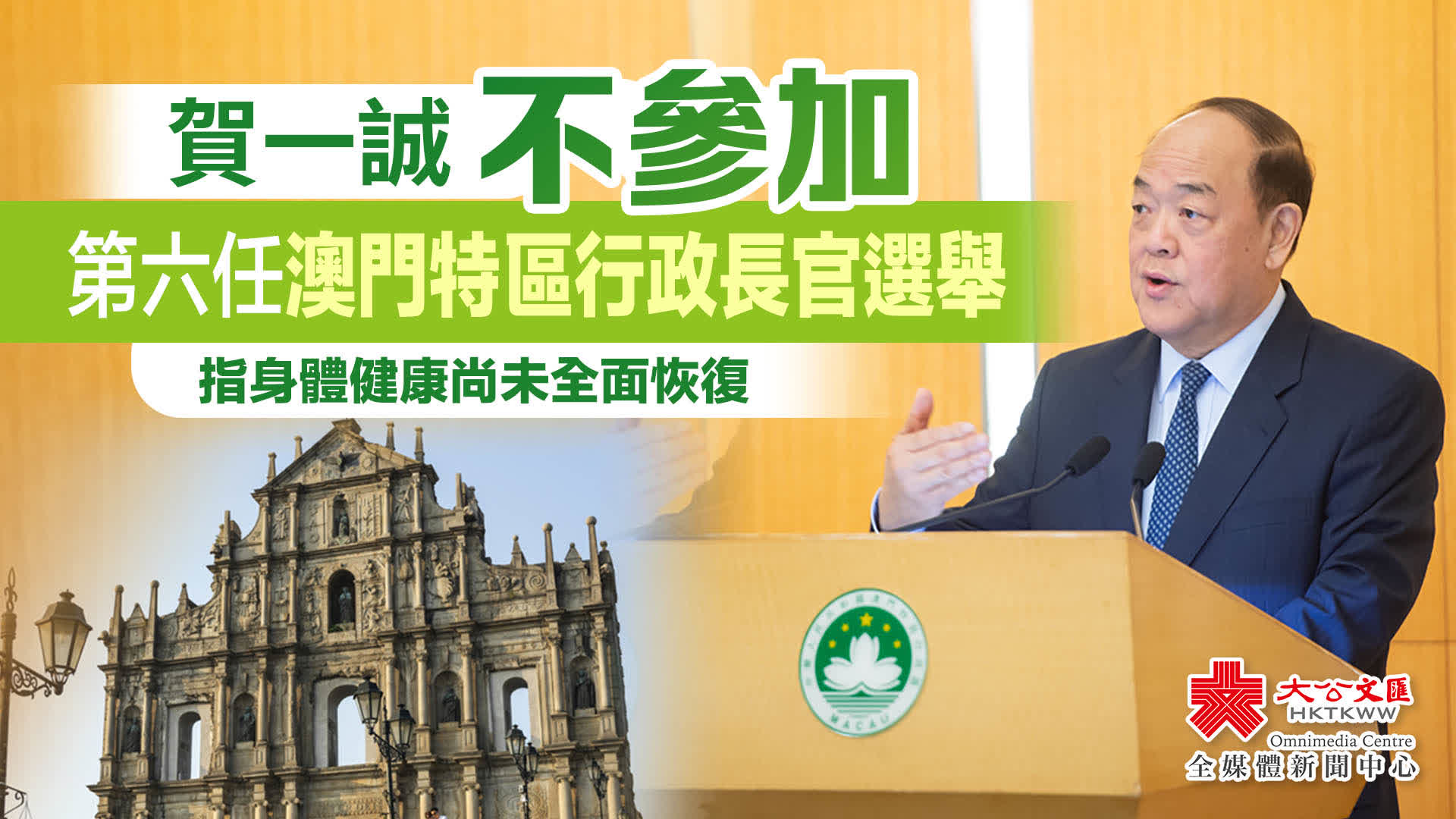 大公文匯全媒體報道,澳門特別行政區將於10月13日舉行第六任行政長官選舉,提名期於8月29日至9月12日展開。澳門特區行政長官賀一誠今日(21日)發聲明指,不參加第六任行政長官選舉,是首名不尋求連任的澳門行政長官。