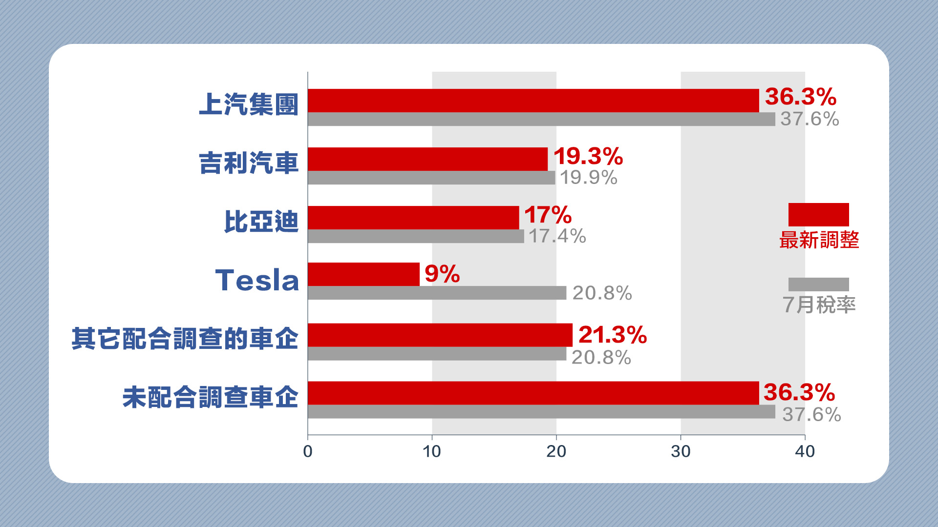 不過,小鵬汽車(09868)、蔚來(09866)、零跑汽車(09863)、長城汽車(02333)等被評為配合調查的車廠,稅率就由7月初公布的20.8%,上調至21.3%。