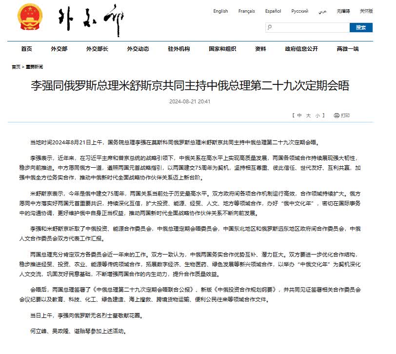 據外交部網站消息,當地時間2024年8月21日上午,國務院總理李強在莫斯科同俄羅斯總理米舒斯京共同主持中俄總理第二十九次定期會晤。