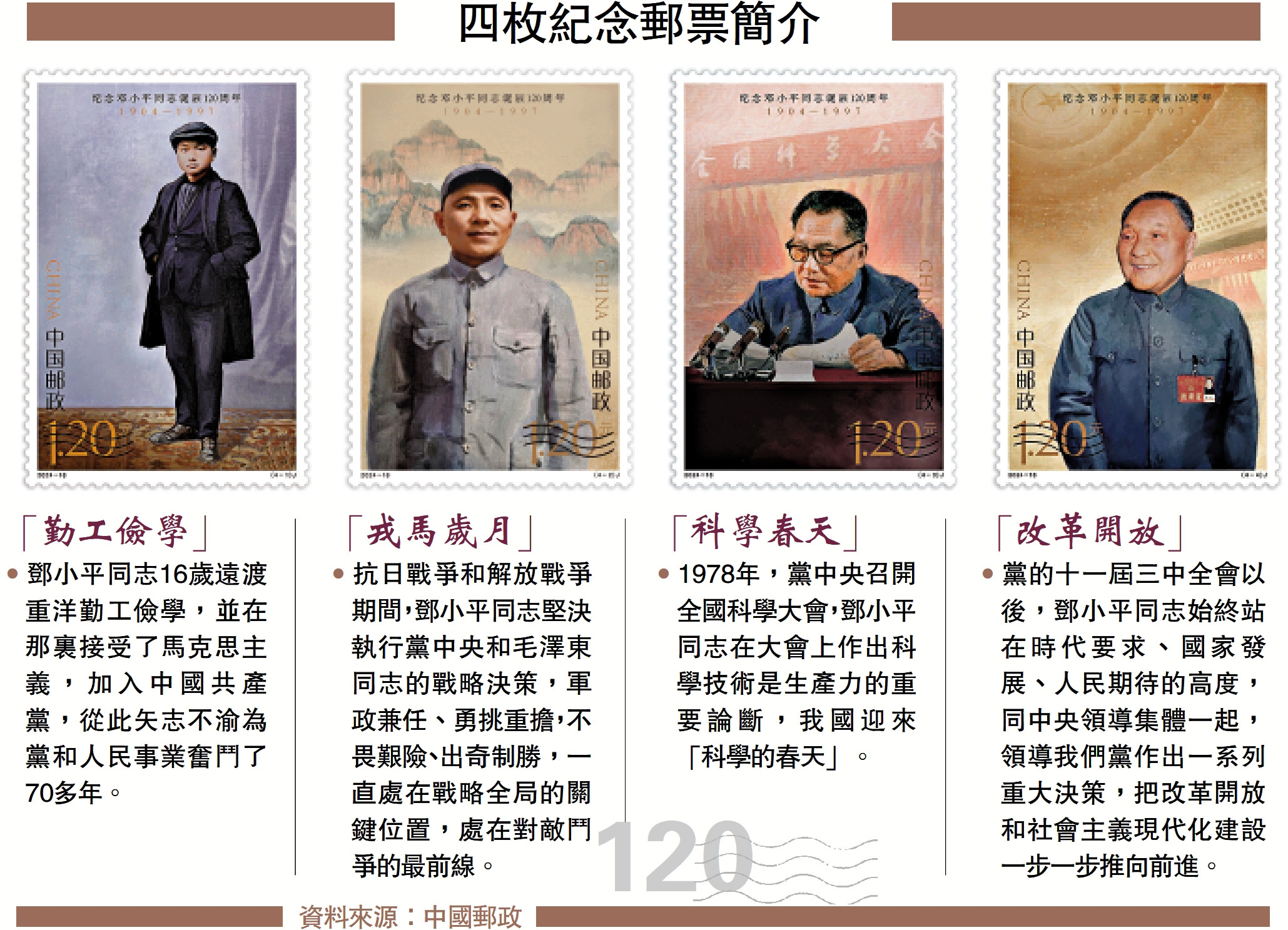 中國郵政定於8月22日發行《紀念鄧小平同志誕辰120周年》紀念郵票1套4枚,郵票圖案名稱為勤工儉學、戎馬歲月、科學春天、改革開放。