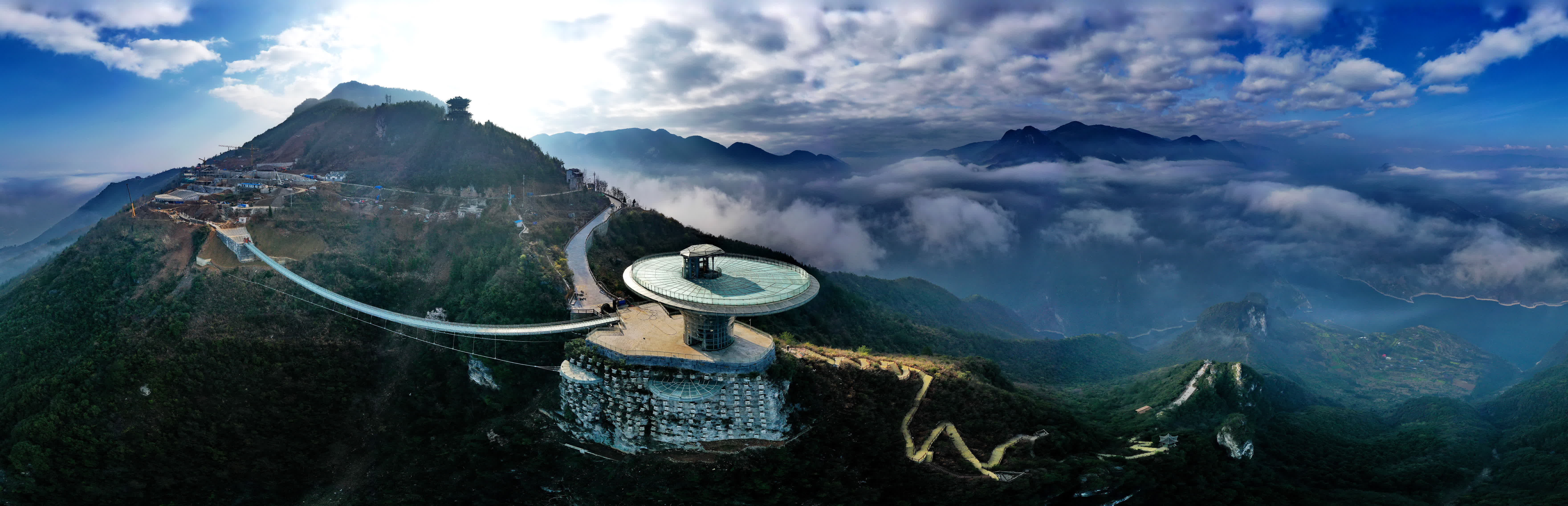巴東縣在山頂特別建設了一條土家族特色的巫峽天街,佔地約10萬平方米,酒店、民宿、餐飲、名特産品展示等業態一應俱全。走過天街,跨過一道130米長的玻璃橋,就抵達了「靈芝仙台」——一個造型酷似靈芝的巨大玻璃觀景平台,挺拔於崖頂,群山大江都在脚下,無限風光盡收眼底。