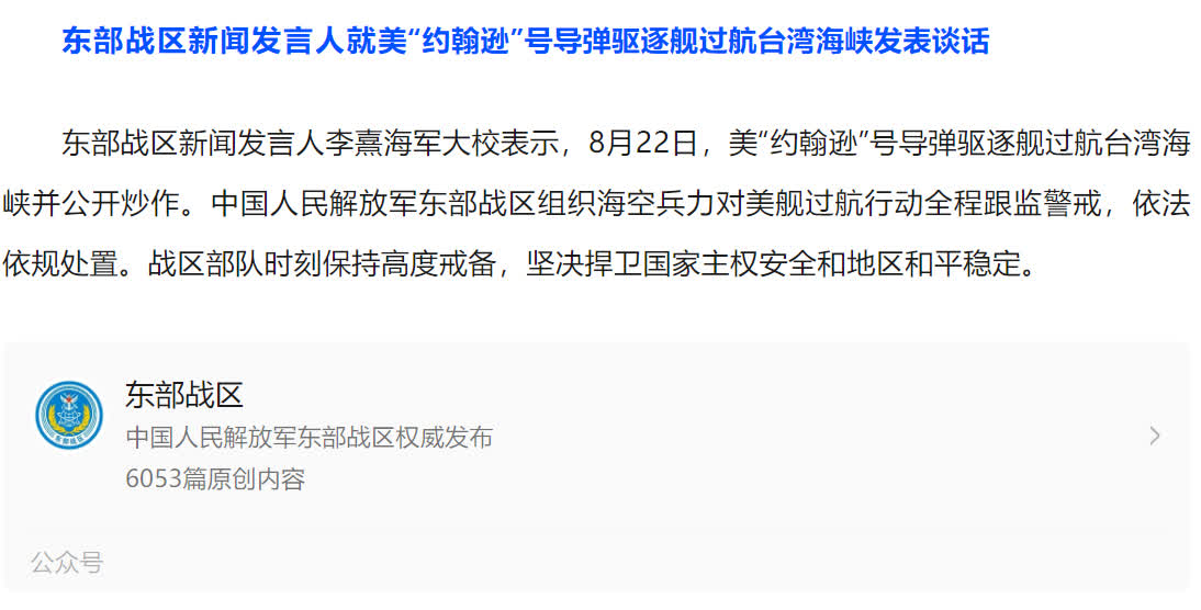 據東部戰區微信公眾號消息,東部戰區新聞發言人李熹海軍大校表示,8月22日,美「約翰遜」號導彈驅逐艦過航台灣海峽並公開炒作。中國人民解放軍東部戰區組織海空兵力對美艦過航行動全程跟監警戒,依法依規處置。戰區部隊時刻保持高度戒備,堅決捍衛國家主權安全和地區和平穩定。