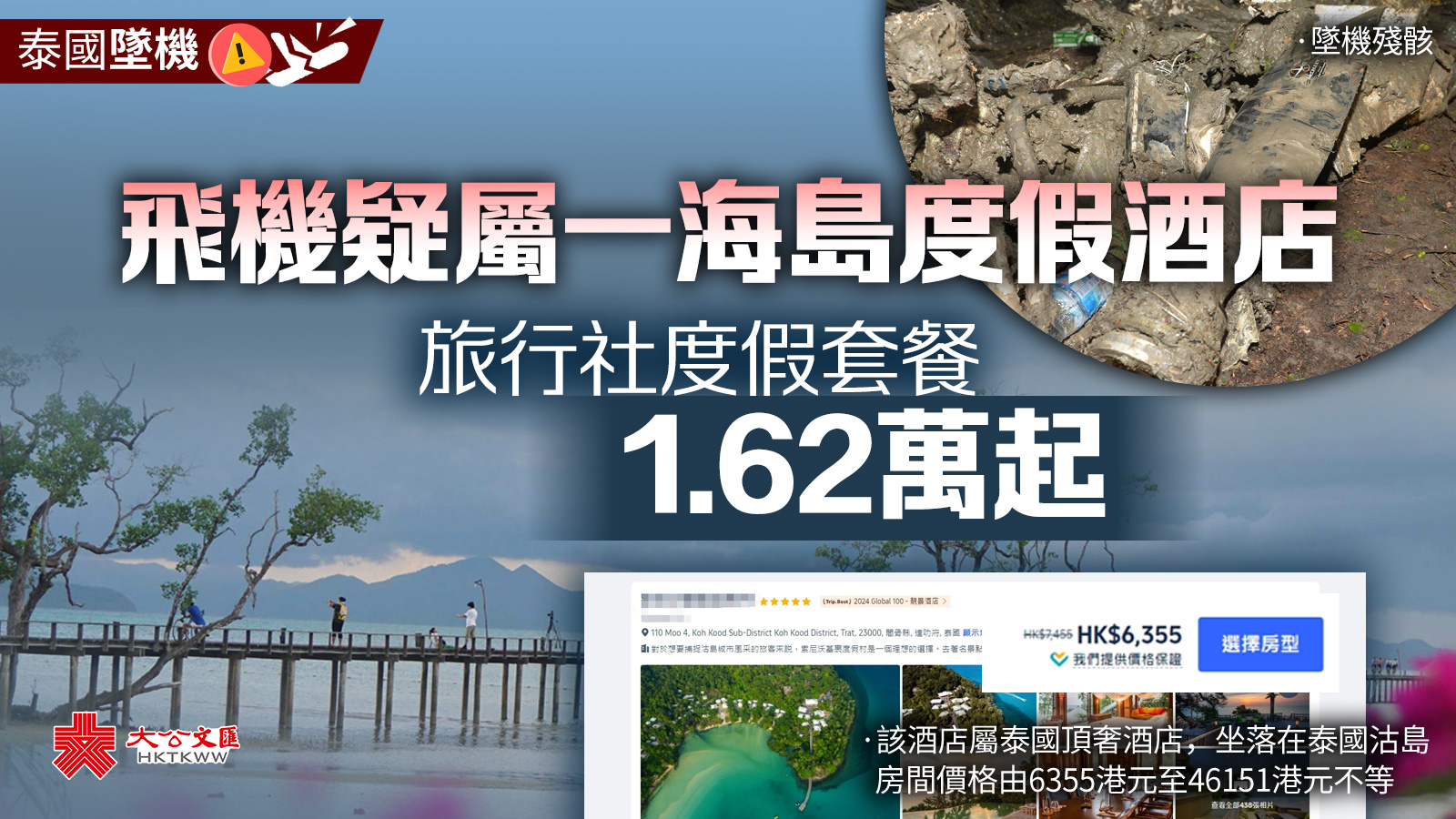 大公文匯全媒體報道,泰國22日發生一宗小型飛機墜機事故,9人罹難,當中包含5名中國公民。泰國當地官員指,當中包括2名未成年人,分別為12歲和13歲。據了解,該飛機系達叻府一海島酒店的私人飛機,有內地旅行社曾推出該酒店4天3晚的度假套餐,成人價格為1.6萬元(人民幣,下同)至1.9萬元不等。今日(23日)凌晨,有媒體諮詢該旅行社客服,對方稱已經去不了了,隨後下架了這一產品。