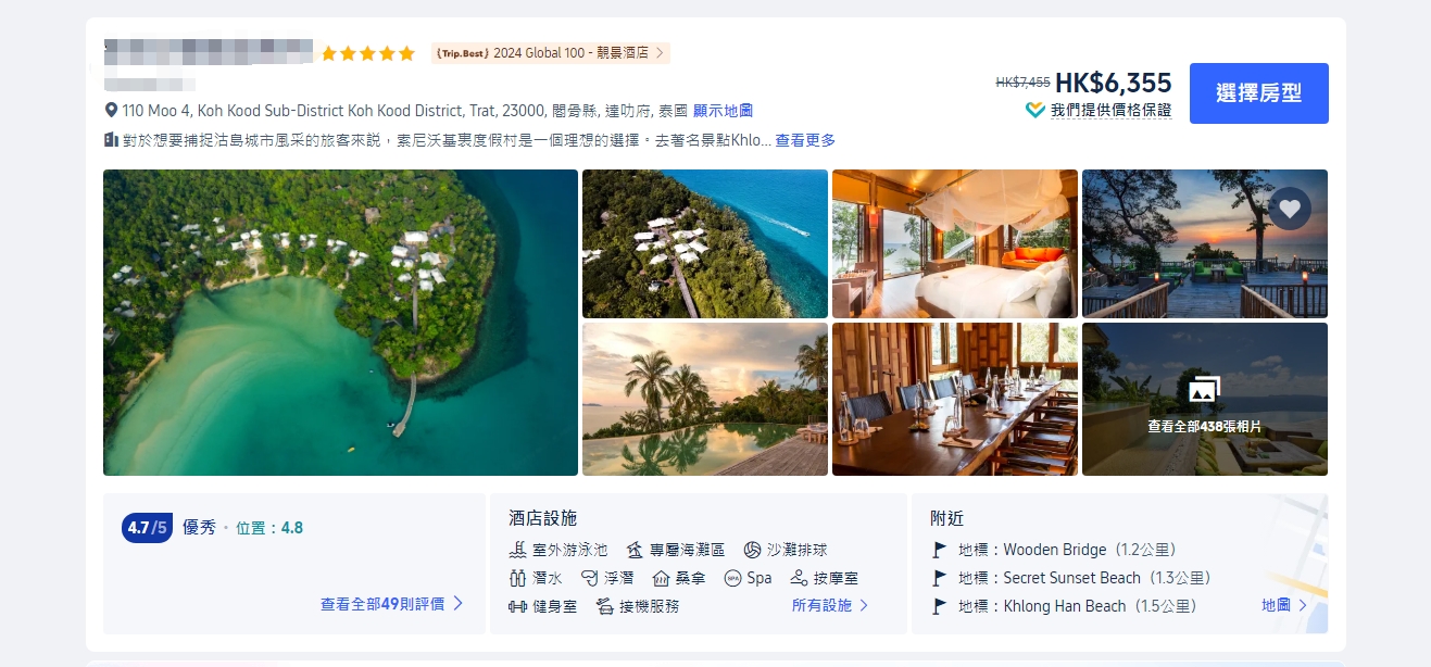 在本港旅行平台可見,該酒店屬泰國頂奢酒店,坐落在泰國沽島,2009年開業,客房數量共有33棟私人別墅,還有一家可以在樹上用餐的全球知名餐廳,房間價格由6355港元至46151港元不等。酒店提供曼谷到素萬納普機場來回的私人小飛機收費接送服務;還提供素萬納普機場到碼頭的私人收費接送機服務,及碼頭到酒店的私人快艇服務。