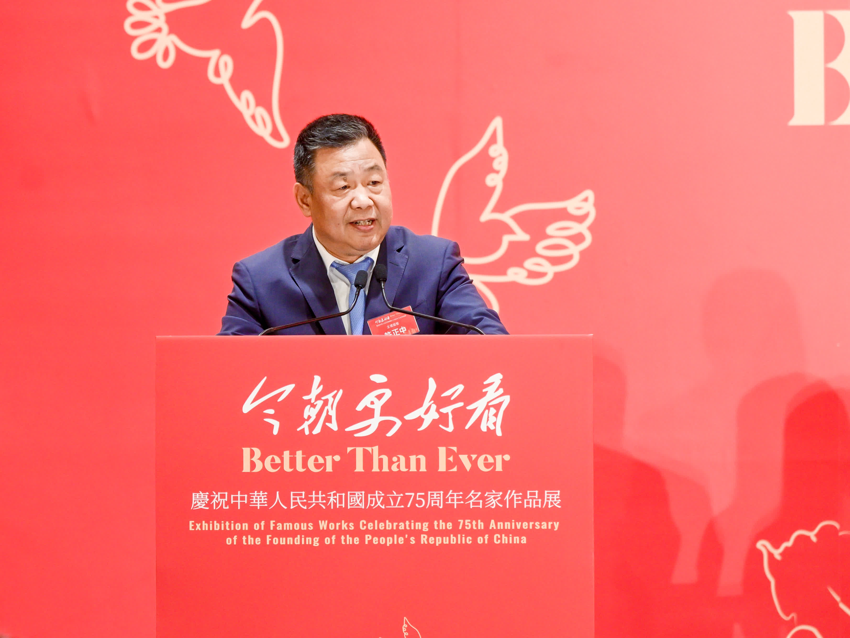 紫荊文化集團董事長許正中致辭時表示,「新中國成立後,一代代書畫藝術家奔赴國家經濟社會建設最前沿,用水墨丹青再現中華兒女改造山河的偉大創舉,形成了一大批具有獨特藝術風格的精品力作。此次展覽匯聚了齊白石、徐悲鴻、李可染、傅抱石、錢松嵒、關山月等一批現當代藝術大師的作品。這批經典之作,是經國家文物局特別批准才得以首次來港展出,殊為難得。尤其是一批港澳藝術家參展的藝術精品,視野宏闊,藝術精湛,風格多樣,相信一定能給香港市民帶來全新的視覺體驗和藝術享受。」