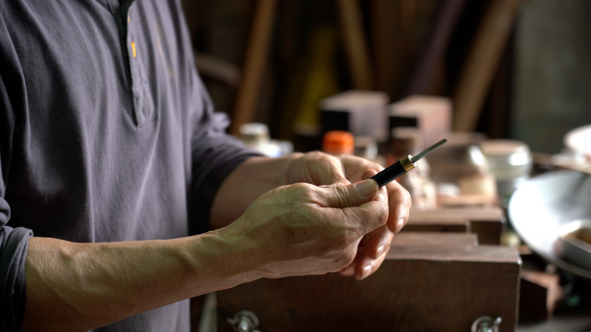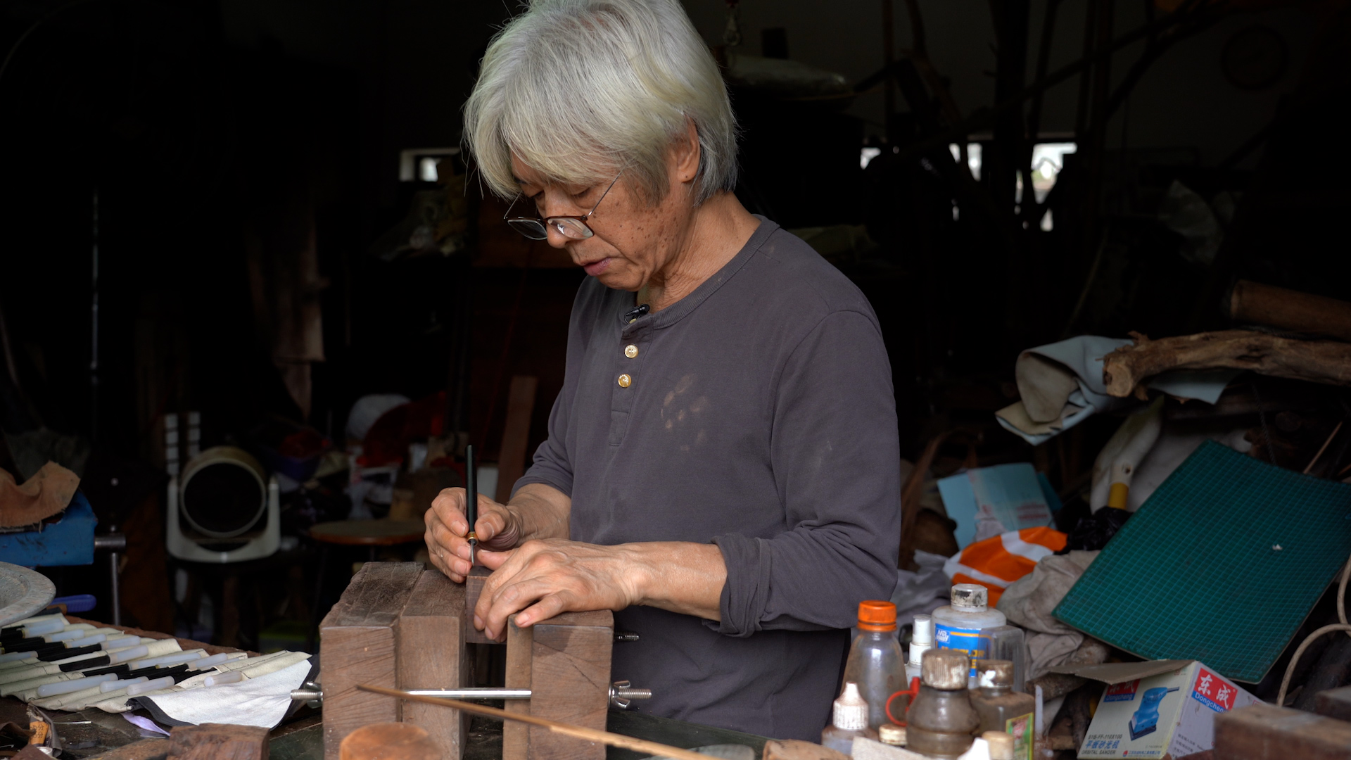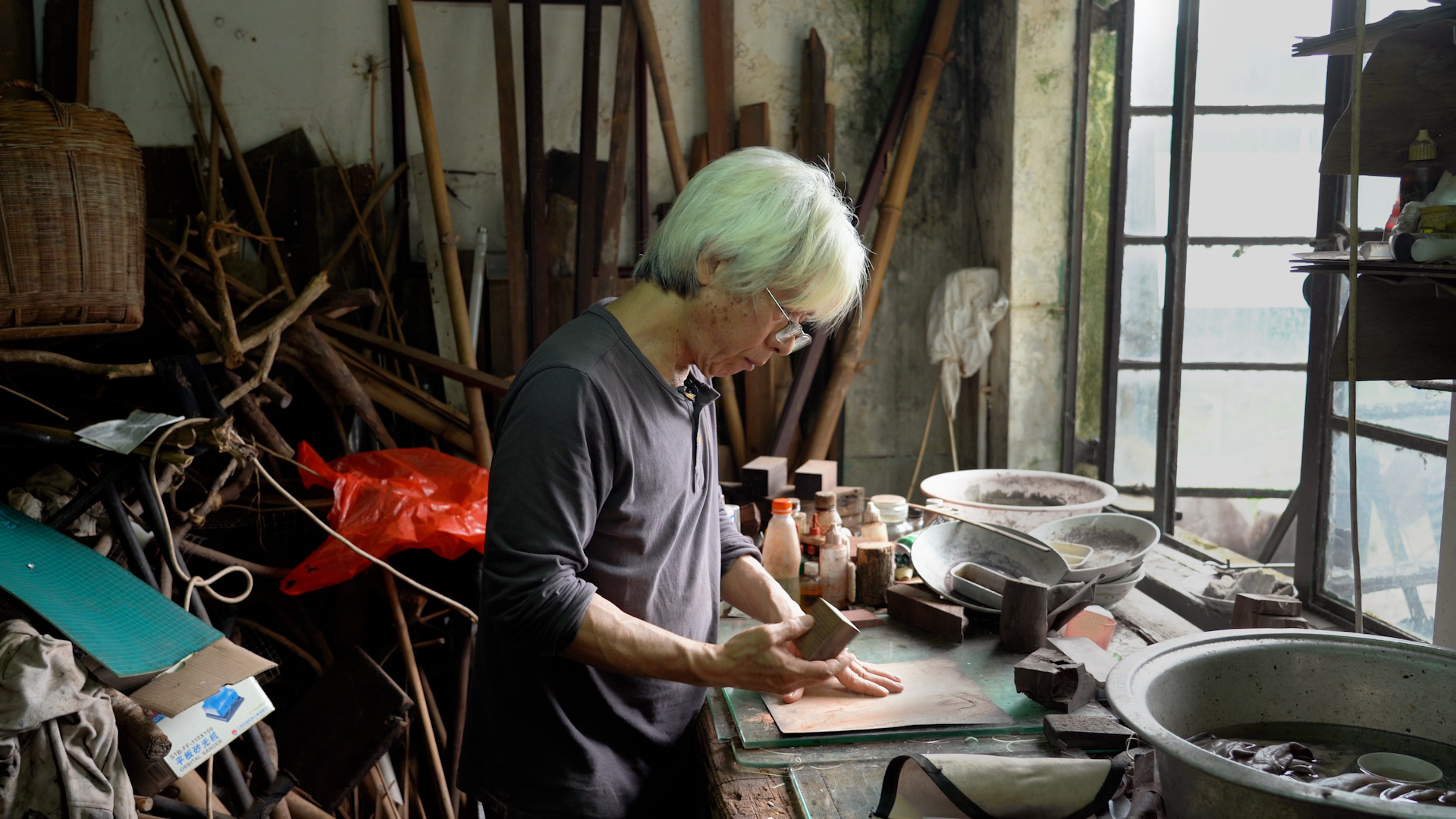 沿着雜物堆中的一條「小路」,終於來到了李文生的工作桌,他正拿着一塊木頭準備雕刻。一開始李文生會用銼或者砂紙將木塊的正面以及側面打磨平整,然後就會開始畫一個圖案的雛形,之後根據靈感再加加減減。李文生強調,創作是很個人的,不需要理其他人的意見,只要自我感覺良好就好,但是雕刻的手法和基本功則需要練習。李文生手持雕刻刀很輕地刻了一條線,手法相當柔和。他一邊刻一邊說,雕刻的力量不能太大也不能太小,心境要很平和,不可以急。