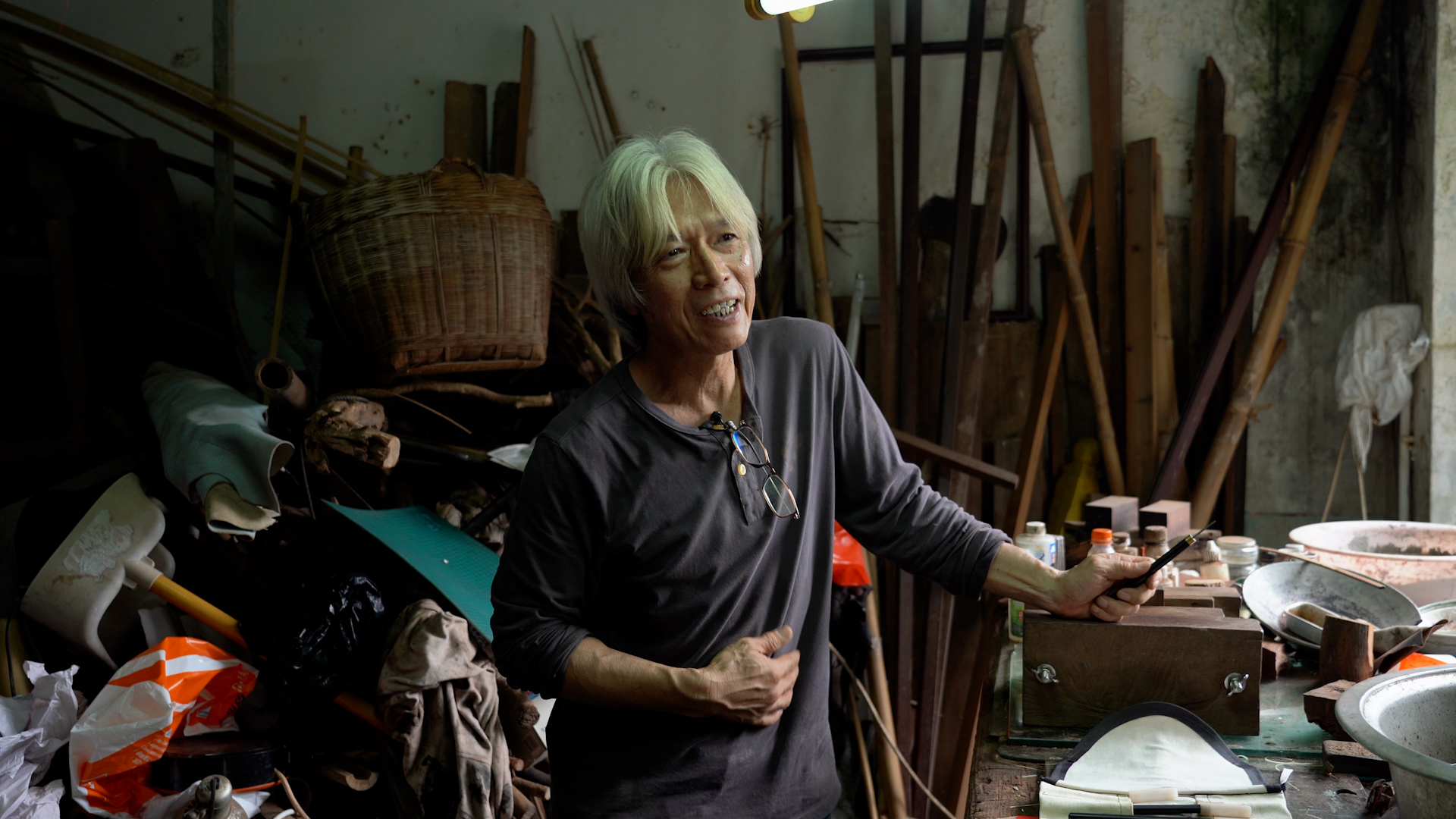起初還有些不習慣鏡頭的李文生聽到記者對他的工作室頗感興趣後,突然精神一振,十分熱情地帶着記者來到了他的工作室。李文生的工作室更像是一個「雜物室」,四周都放滿了大大小小不同的雜物,例如舊的衣櫃、桌櫈,過時的農耕器具等等數不勝數。李文生說,這些都是他從別的村民那裏收集回來,大部分都是村民們棄置的,而他卻認為這些物件都是村中的一部分,很有歷史價值,更是長嘆惋惜有很多的物件因潮濕而被白蟻蛀蝕。