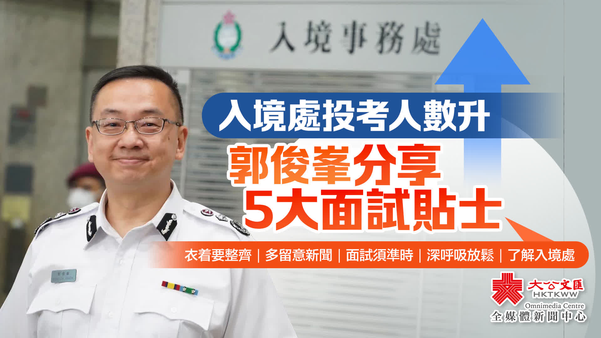 大公文匯全媒體報道,入境事務處本年度目標招聘約380名人員,包括100名入境事務主任及280名入境事務助理員。入境處處長郭俊峯近日表示,本年度有7700人投考入境事務主任,較去年增加2成;至於入境事務助理員,截至上月底共收到6227個申請,較去年同期增3成。他更分享投考的5大貼士,籲有志投考者做好準備。