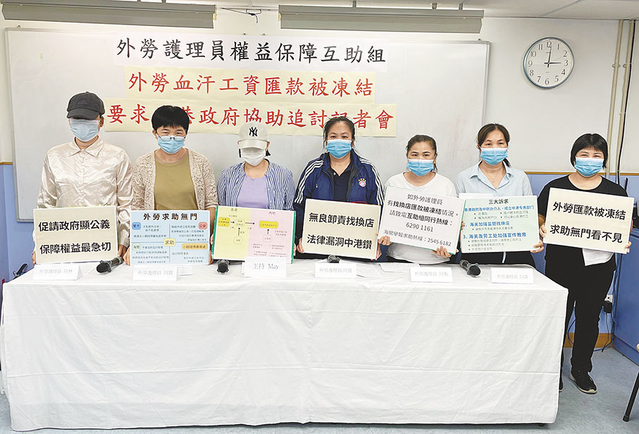 外勞護理員權益保障互助組昨日在記者會上表示,外勞透過在港持牌找換店匯款回鄉,結果被懷疑匯款是洗黑錢而惹上官非。該組織接獲的19名求助苦主,其中16人為外勞護理員,涉事金額超過100萬港元,有個案涉及金額高達14萬港元。