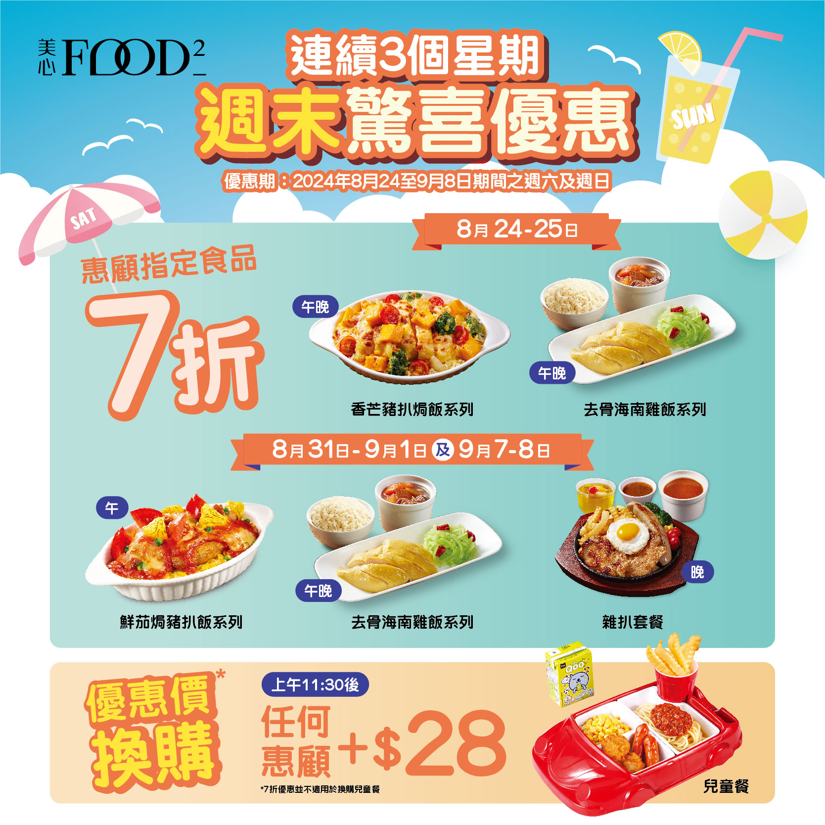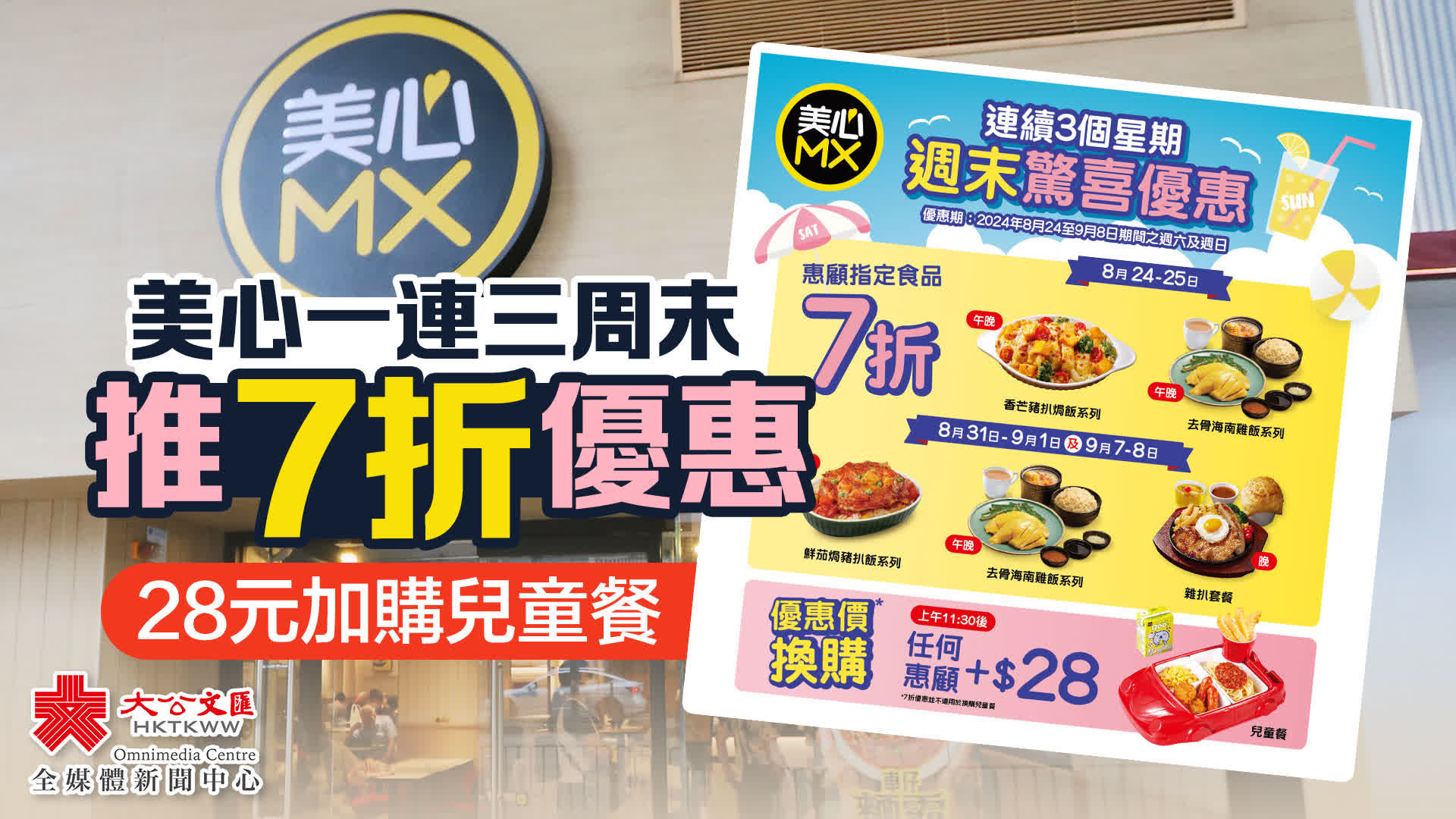 大公文匯全媒體報道,美心MX同美心Food²連續3個星期周末推出指定食品7折優惠,還可以用28元優惠價加購兒童餐,一家大細都食得開心。