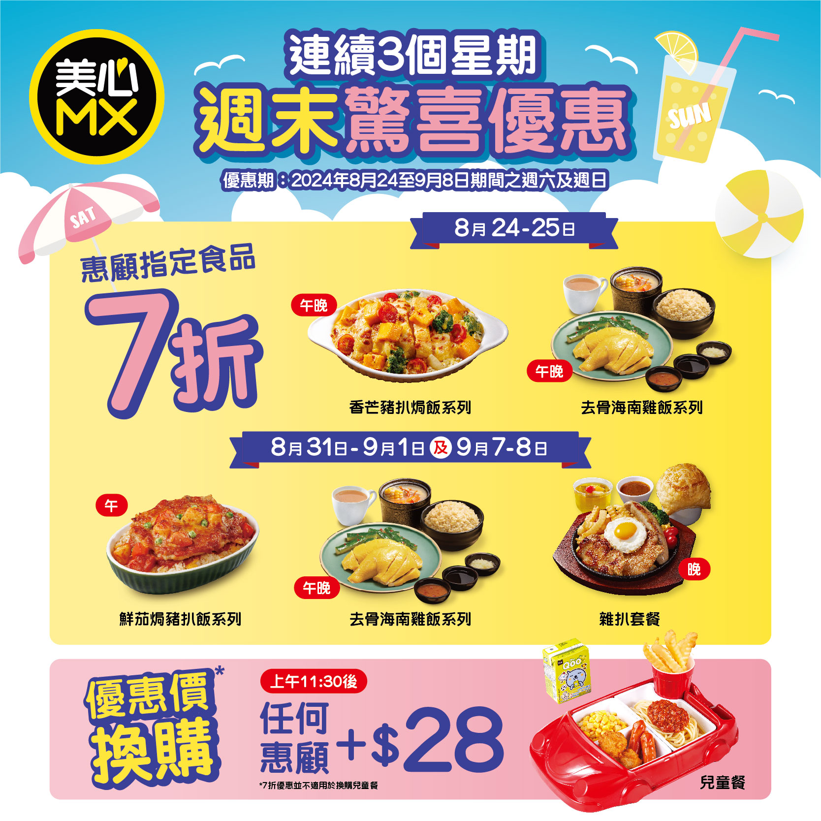 優惠只適用於全線美心MX(大會堂MX、大學站MX、西九高鐵站MX、機場中場MX)及美心Food²分店(紅磡美心Food²分店除外)。7折優惠只適用於去骨海南雞飯系列、香芒豬扒焗飯系列、鮮茄焗豬扒飯系列及雜扒套餐。