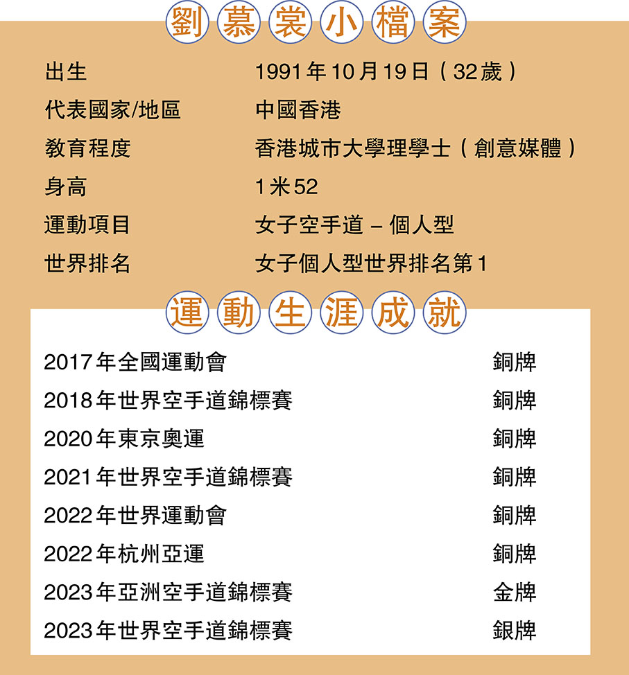 (香港文匯報記者 郭正謙)奧運銅牌、世錦賽銀牌,再加上「世一」頭銜,作為一位空手道運動員,劉慕裳的成就幾乎無可挑剔,忍受着滿身傷患,繼續日復一日的訓練和比賽,只因當初穿上港隊戰袍的自豪感仍然深深印在腦海當中,在她心中空手道個人型永無止境,只有通過千錘百煉才能探索更高境界。曾經的香港空手道隊是旁人眼中的「魚腩部隊」,她卻要證明香港運動員最擅長迎難而上,由場上的每一拳每一腳,到場下的每一次克服困難挫折,都是劉慕裳對香港精神的演繹。