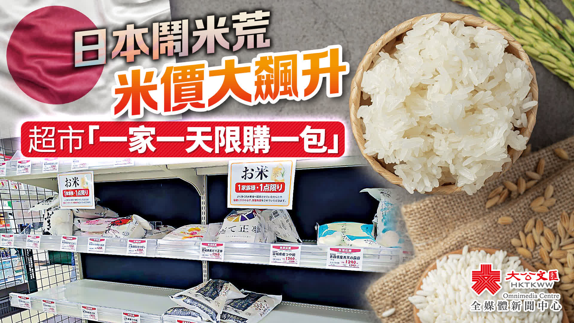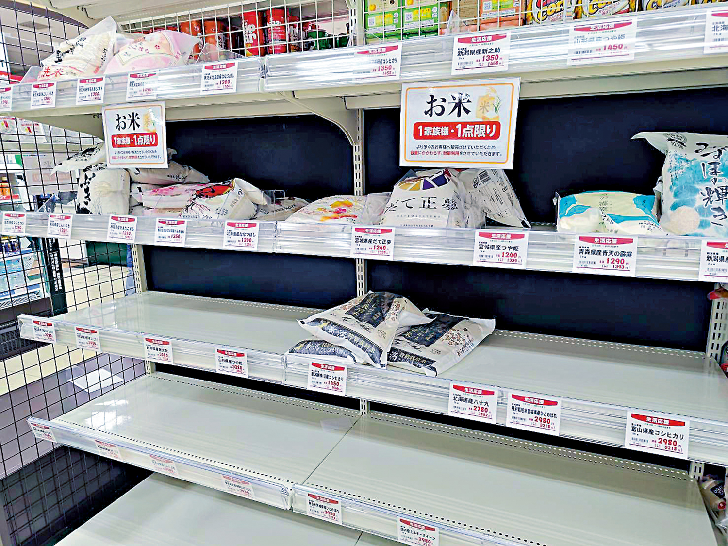 日本民眾在社媒平台X上發文稱:「花了2個小時坐電車去買,找了6家店全部賣光了!已經沒有後天的米了!」供應緊缺還導致大米價格飆升,日本一家超市表示,5公斤一包的大米價格在今年3月售價為1480日圓(約80港元),但目前已上漲了1000日圓。此外,飯糰和仙貝等相關商品也受到波及而漲價。