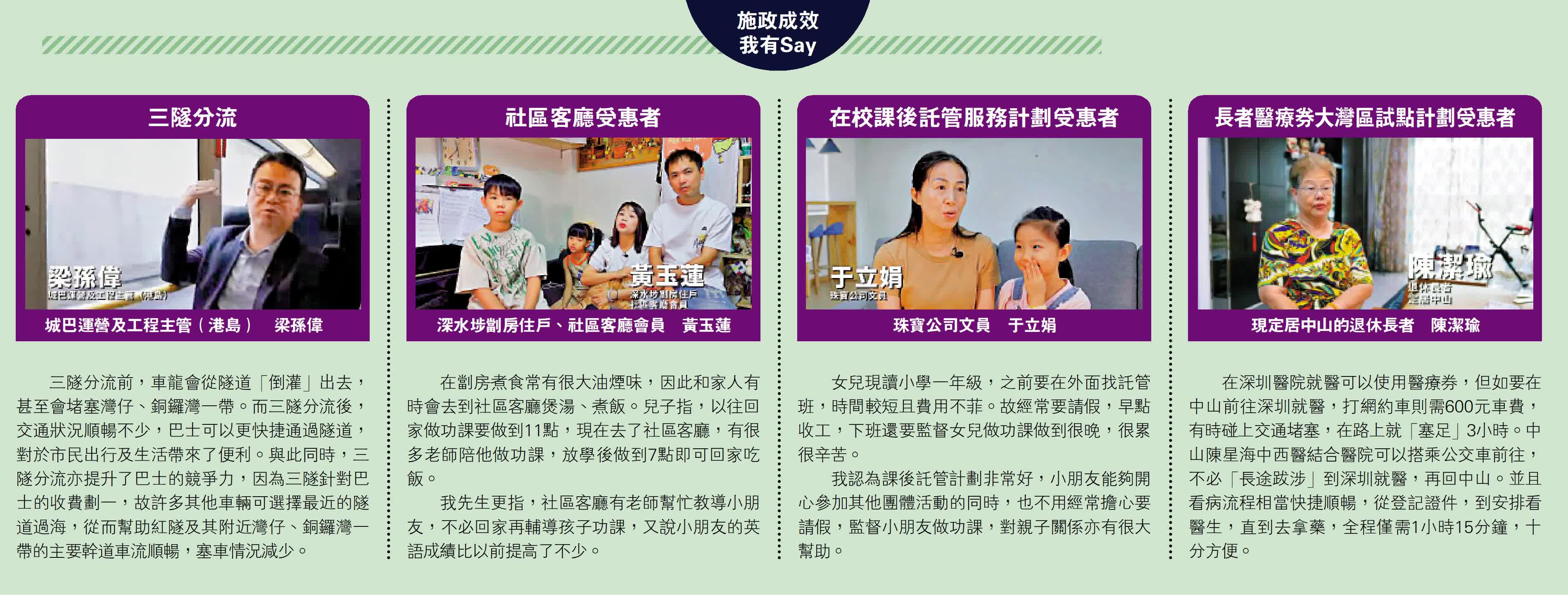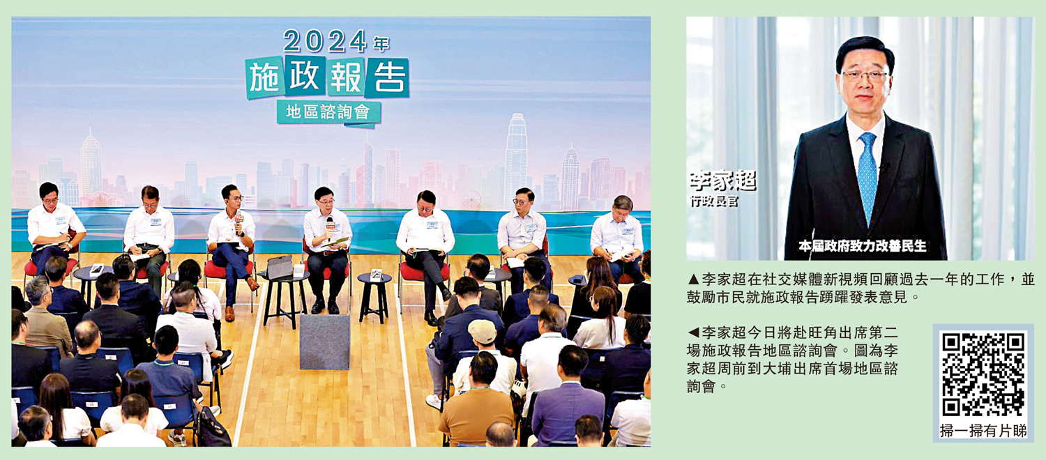 (大公報記者 龔學鳴)行政長官李家超將於10月發表任內第三份施政報告。他昨日在社交媒體上發表影片回顧過去一年的工作,特區政府在醫療、育兒、交通、房屋等各方面不斷作出努力,推出「社區客廳」、「在校課後託管服務計劃」等多項便民措施。多位受惠市民在影片中講述了自己生活的變化,並對便民措施的落實表示了積極的肯定。「細節成就大局」,李家超期望,繼續致力改善民生,讓市民生活得更好。