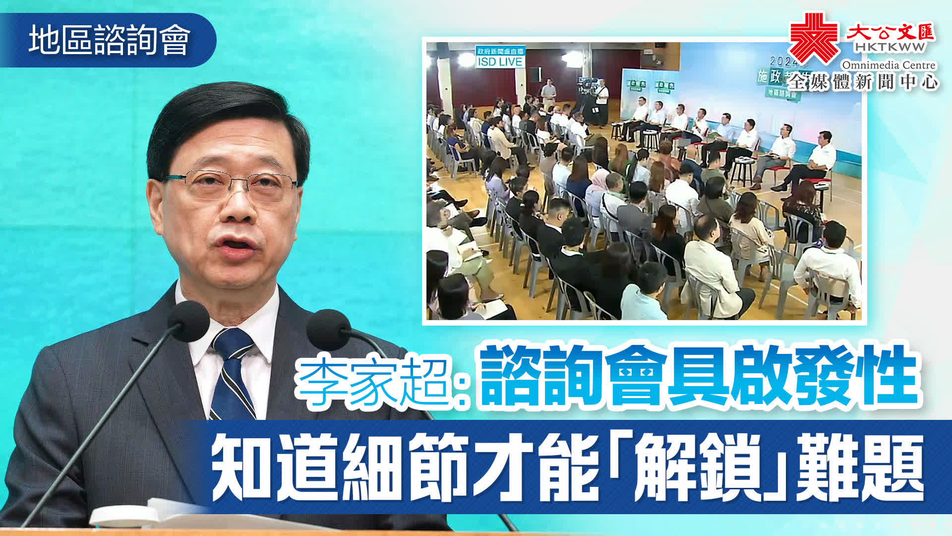 李家超衷心感謝出席諮詢會和觀看直播的市民,強調政府重視地區諮詢,市民的意見有助官員了解不同地區問題,知道細節才能「解鎖」問題。他形容,大埔諮詢會具有啟發性,對政策落實和資源運用很重要,期望稍後的環節用盡諮詢時間,聆聽市民意見,並且適時分享自己個人看法。