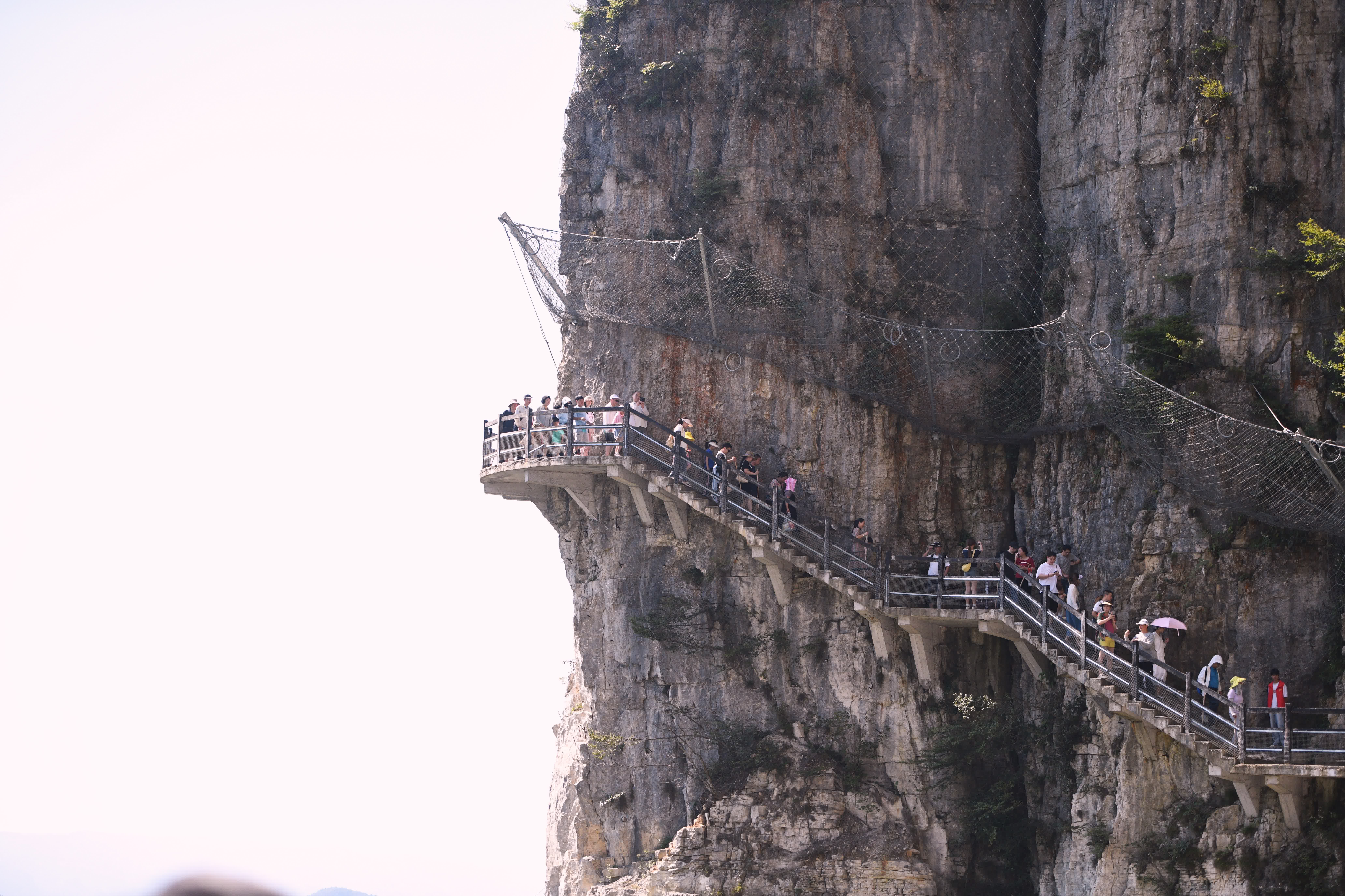 除了鬼斧神工的自然景觀,七星寨景區內還設有一條絕壁棧道供遊客體驗。棧道全長488米,建在海拔1700餘米的絕壁山腰間,淨高差達300餘米。走在棧道上,一邊是陡峭的山壁,一邊是深不見底的峽谷,讓遊客心驚腳軟的同時也感受到大自然的壯闊與神奇。