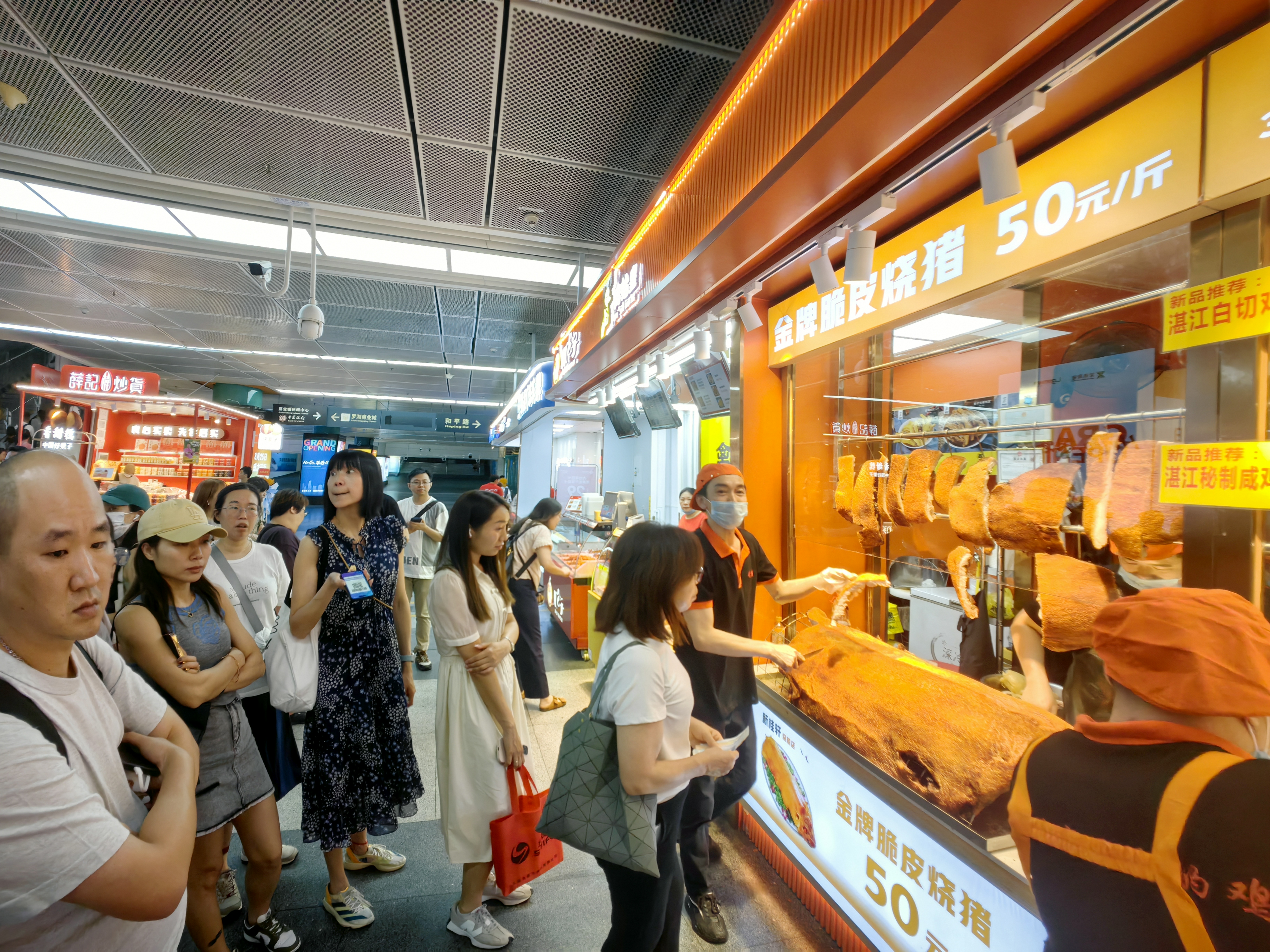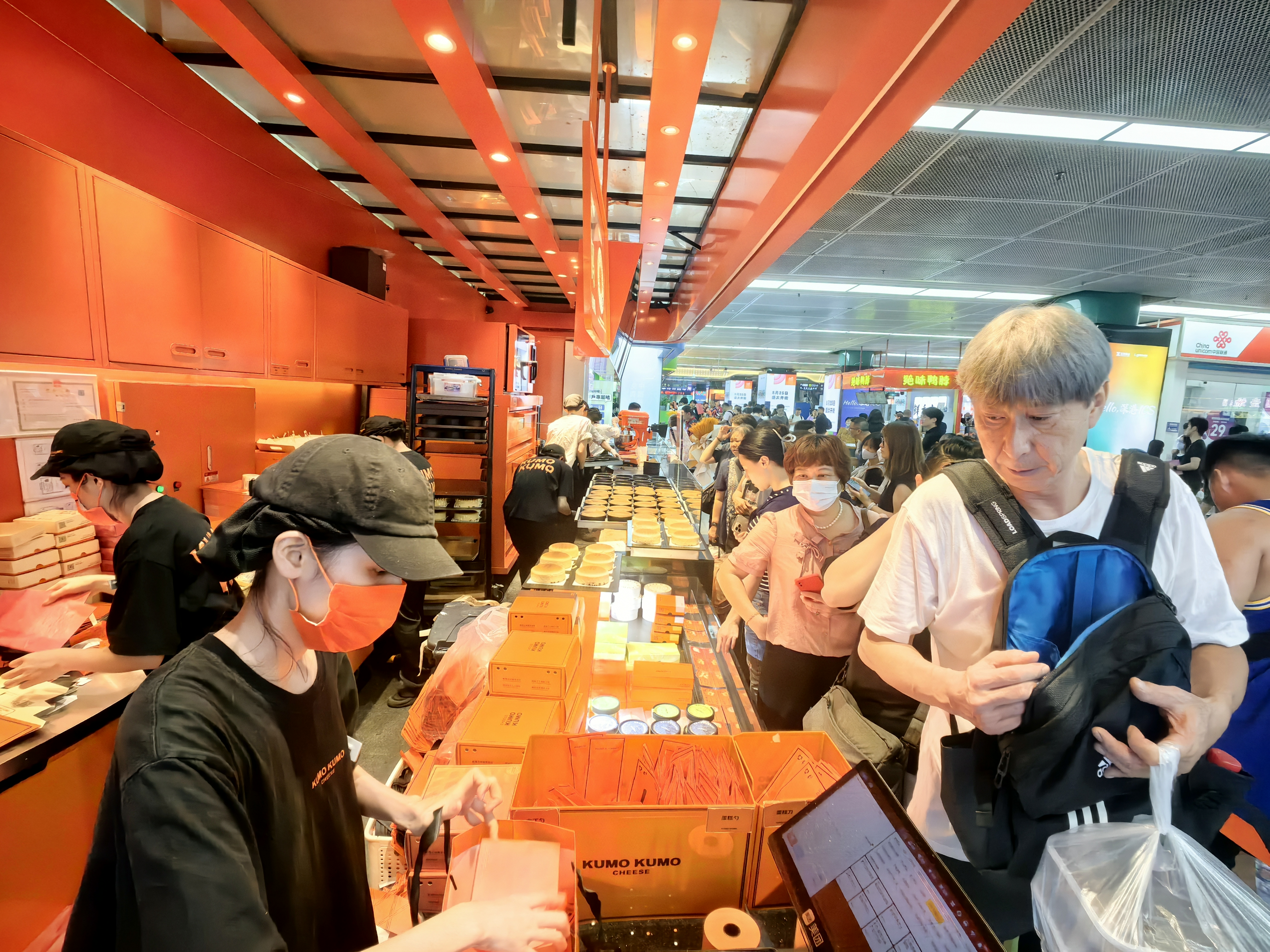 (大公文匯網記者郭若溪報道)「從羅湖地鐵站出站,返港前順手買盒芝士蛋糕,再來半斤燒味,高峰期還能微信提前下訂,太方便了,這裏是商業街購物氛圍大變樣。」8月25日,由深鐵商業攜手綠景資產共同打造的深鐵匯坊丨深港融合商業街正式開街。記者看到現場人潮湧動,不少香港客人在排隊購買核桃酥、芝士蛋糕和燒味等美食帶回香港,贊稱價格實惠且食材新鮮。