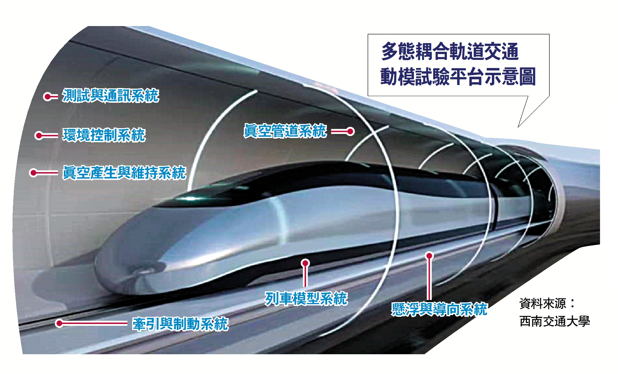 據透露,中鐵二十三局集團參與建設由中鐵磁浮、西南交大主導的四川省重大科技基礎設施「多態耦合軌道交通動模試驗平台」項目,將建設一個長度1500米、管道直徑3米、最低氣壓0.005標準大氣壓、試驗最高時速將超音速的「高架結構真空管道磁懸浮交通試驗線」及其相關配套設施。