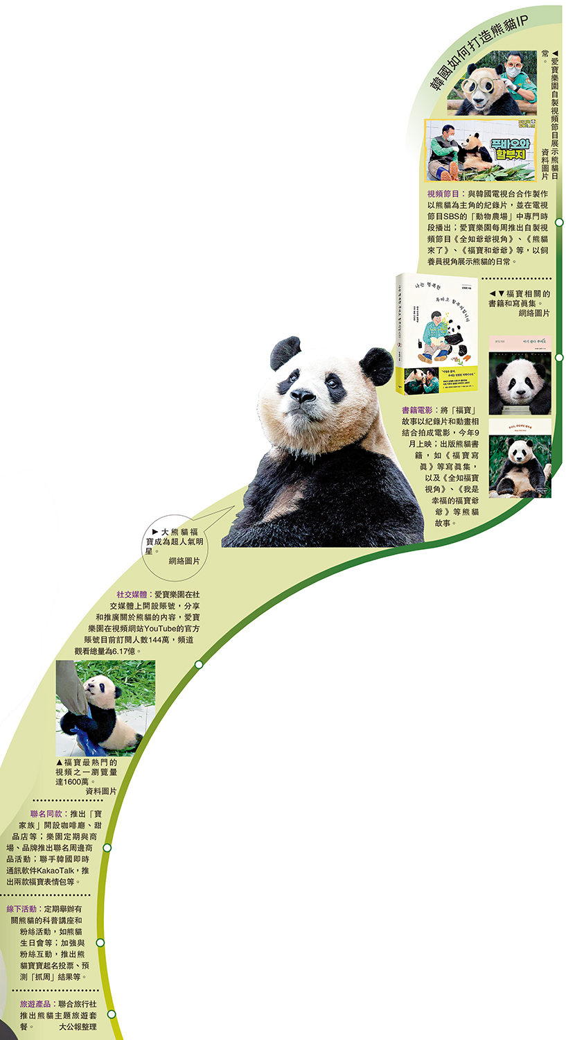 作為韓國的「頂流女明星」,昵稱為「福公主」的大熊貓「福寶」,深得民眾喜愛。「福寶」出生於2020年7月20日,是旅韓大熊貓「愛寶」(華妮)和「樂寶」(園欣)在韓國愛寶樂園誕下的第一隻幼崽,也是首隻在韓國自然繁育誕生的大熊貓,一出生便受到韓國民眾的關注。據愛寶樂園統計,從2021年1月4日「福寶」開始與公眾見面到牠返回中國前,共吸引遊客約550萬人次,相當於韓國十分之一人口曾到愛寶樂園看過福寶。