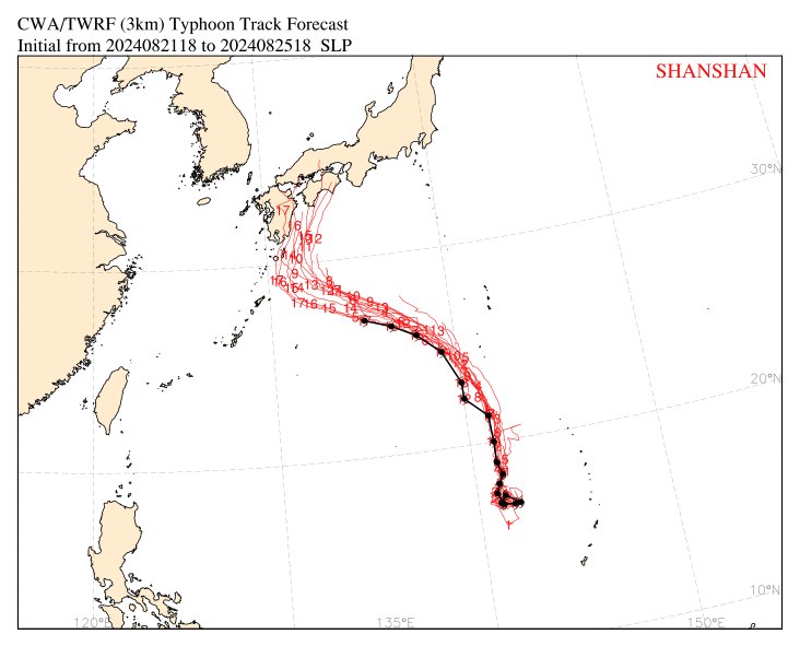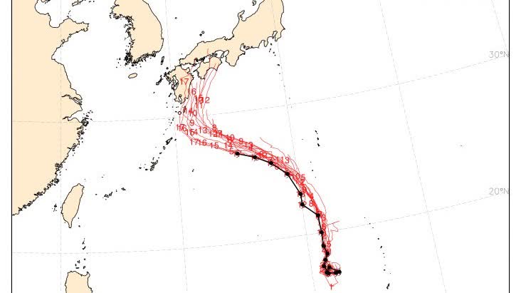 吳聖宇表示,預報路徑(紅線)隨着時間一直向西修正,從原本直撲關西,再向西調整到四國,現在變成有可能貫穿九州,而實際路徑(黑線)也持續比預報偏西。而最新的預報來看,「珊珊」來到日本附近後還有可能陷入高壓之間的鞍型場內,導致速度變慢,路徑變化也更大,影響日本的時間可能再拉長。
