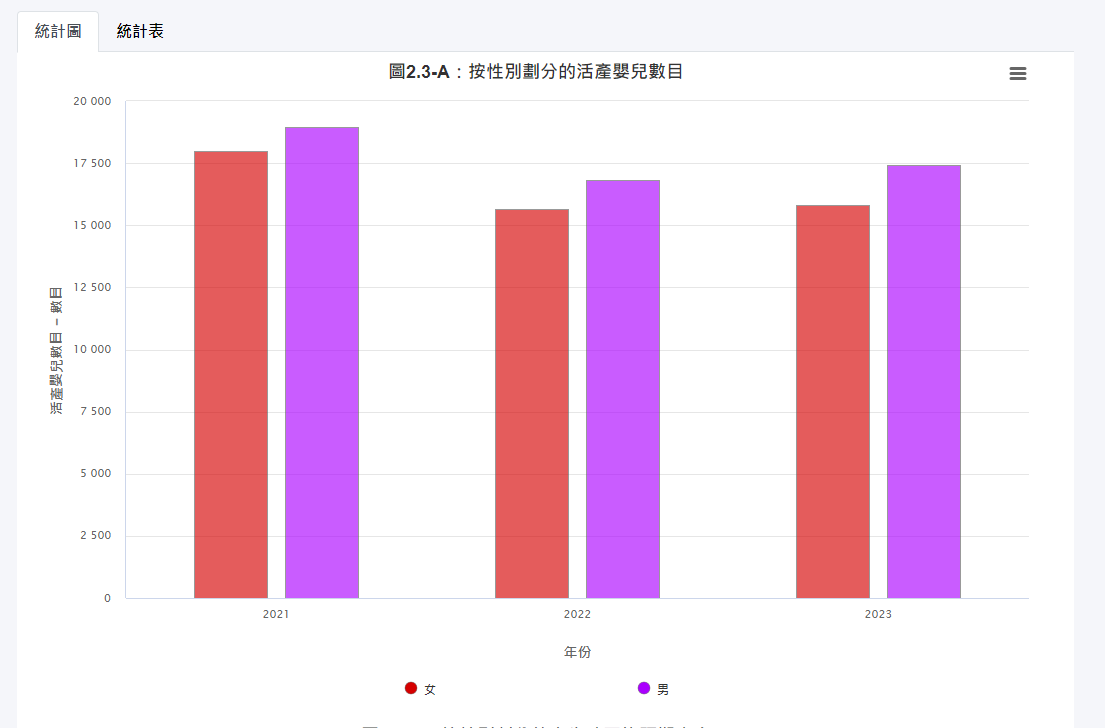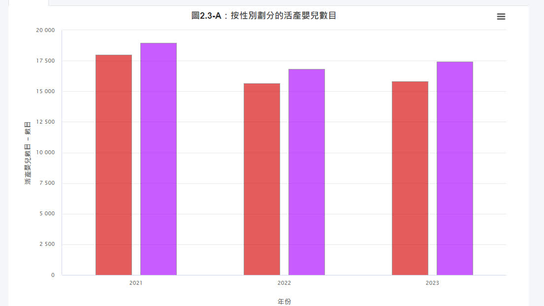 在活產嬰兒方面,在2023年,新生嬰兒數目整體有所上升。女性和男性活產嬰兒的數目分別從2022年的15663人及16838人上升至2023年的15818人及17414人。數據顯示,男嬰已連續三年較女嬰多。