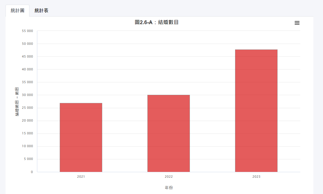 統計處數據顯示,結婚數目由2022年的30012宗上升至2023年的47723宗,增幅約為59%。此外,在2023年,女性和男性的粗結婚率,即每千名人口的結婚數目,分別為11.6及13.9,較2022年的相應比率(女性:7.5;男性:8.9)高。