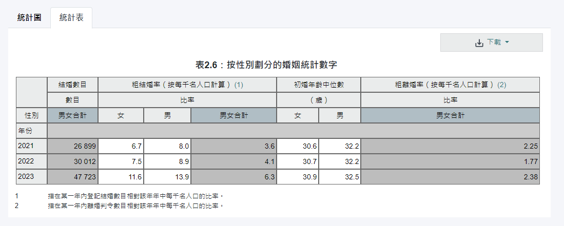 此外,15歲及以上從未結婚的女性和男性數目女性和男性數目分別為100萬人及95萬人,與2022年比較分別增加3.3%及3.6%。至於已婚女性和男性數目分別為203萬人及184萬人,與2022年比較分別增加了2.8%及2.6%。