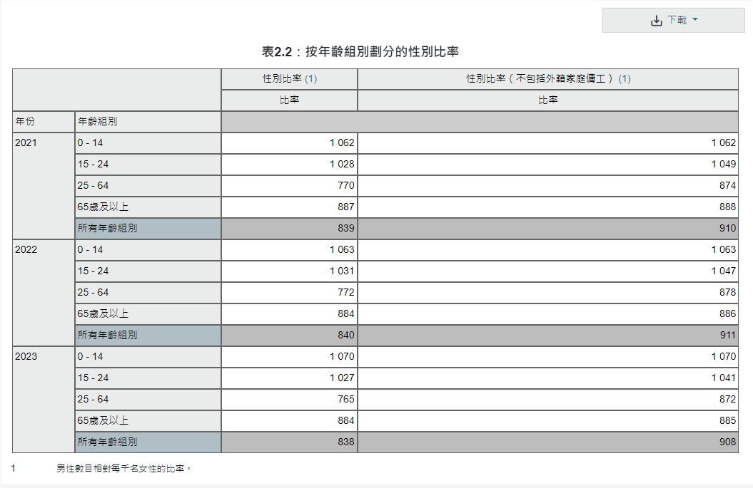 然而,性別比在所有年齡組中仍失衡。在2023年,性別比率為838,即每1000名女性對應838名男性。撇除女性佔大多數的外籍家庭傭工後,性別比率則為908。截至2023年底,香港女性人口數目為410.26萬人,男性人口為342.53萬人,較2022年底分別增加1%及0.5%;女性人口較男性人口多67.75萬人。