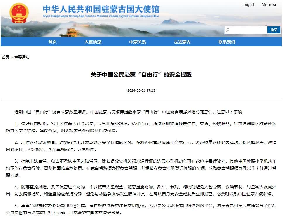 中國駐蒙古使館謹提醒來蒙「自由行」中國遊客增強風險防範意識,注意以下事項: