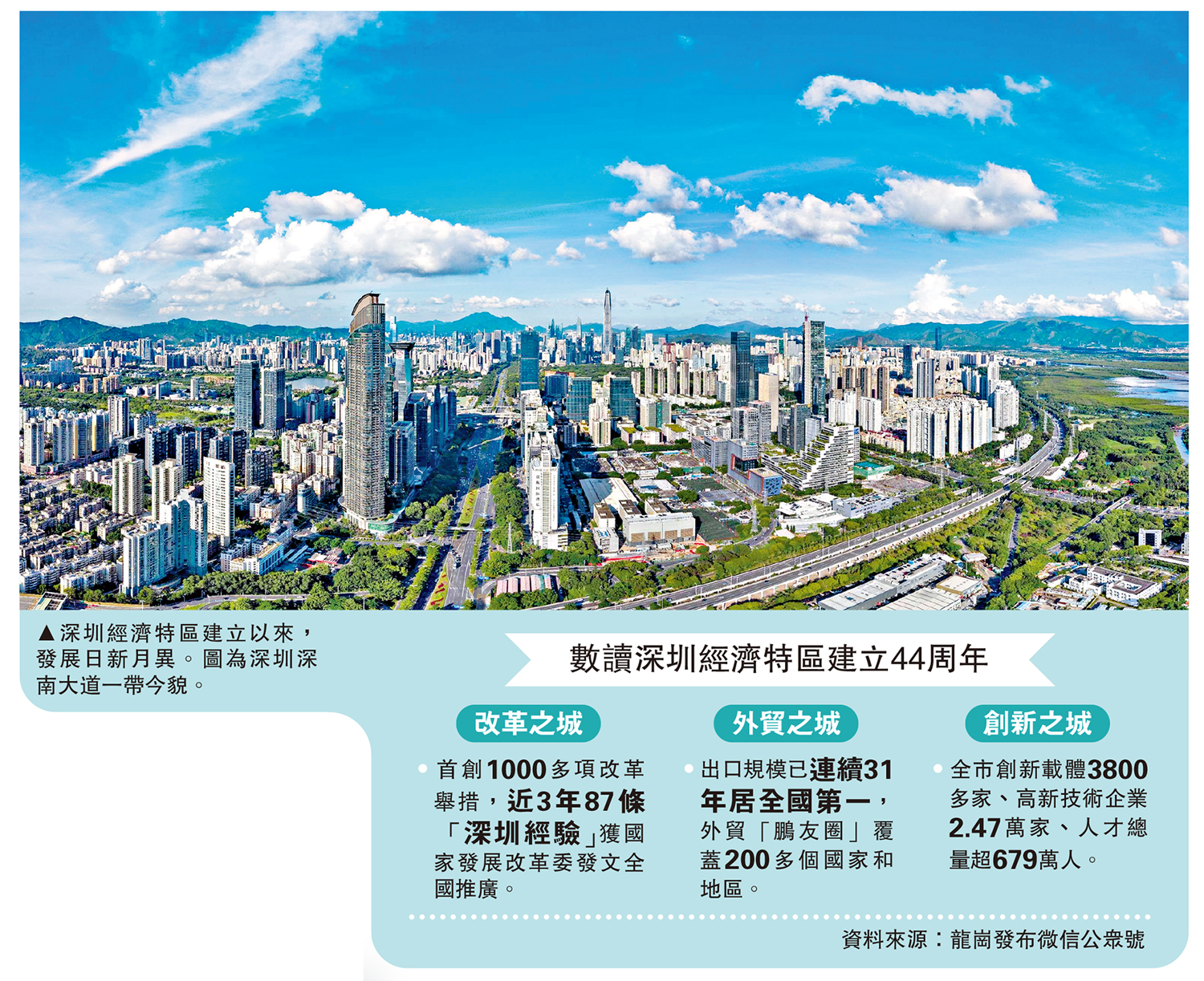 (大公報 記者 李望賢)在1980年8月26日,深圳和珠海、汕頭、廈門等城市一起獲批成為首批經濟特區。經過44年大膽探索,深圳經濟特區屢創發展奇跡,從一個落後的邊陲農業縣蝶變為一座充滿魅力、動力和創新力的國際化城市,地區生產總值從1980年的2.7億元(人民幣,下同)增至2023年的3.46萬億元,增長近1.3萬倍,成為全國改革開放的旗幟、創新發展的標桿、先行示範的使命之城。越改革越發展,越開放越強大,成為深圳經濟特區44年發展史的鮮明啟示。