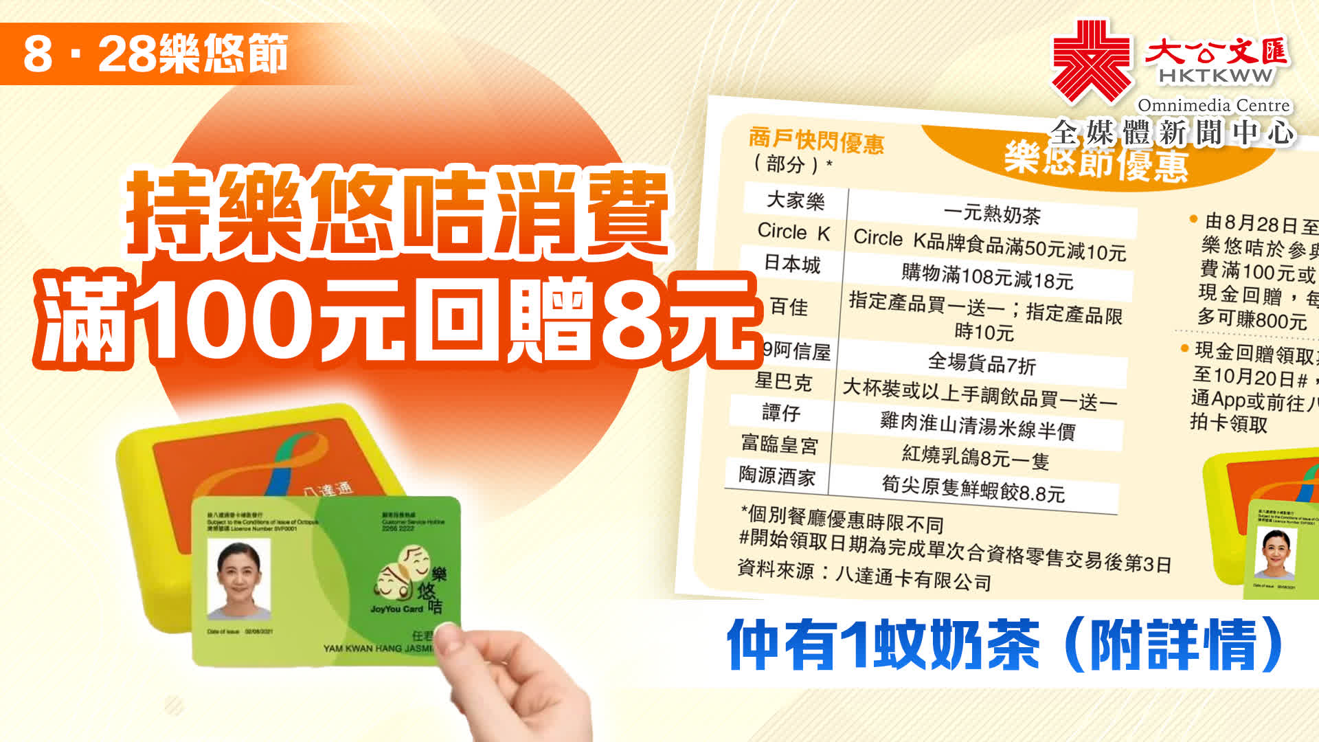 由8月28日至9月10日,「樂悠咭」持有人於8·28樂悠節參與商戶的實體店舖以「樂悠咭」單次消費滿100元,可獲8元現金回贈,每位「樂悠咭」持有人最多可享高達800元現金回贈;現金回贈總值828萬元。推廣期內,每張「樂悠咭」最多可使用此優惠100次,優惠有限,送完即止。現金回贈將於8月31日開始,透過八達通App及八達通服務站拍「樂悠咭」領取。