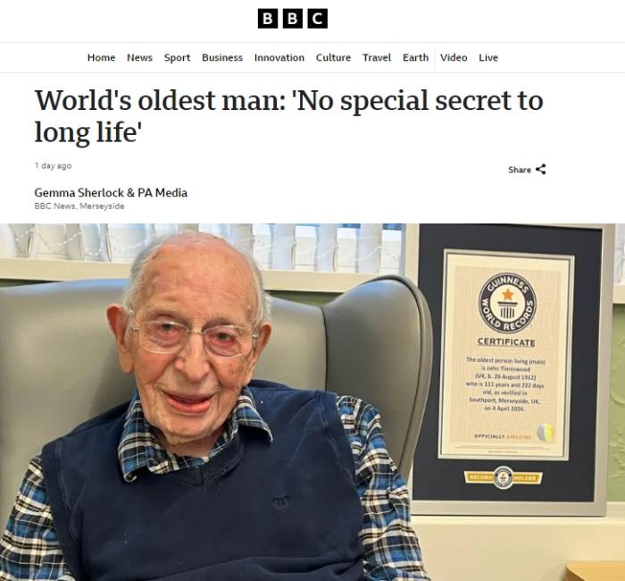 回顧自己漫長的一生,廷尼斯伍德稱或許長壽的關鍵在於「凡事要適度」。「我吃他們給我的食物,其他人也一樣。我沒有特別的飲食習慣。如果你喝得太多,吃得太多,或者走得太多,或者做太多的事情,你最終都會受苦。」
