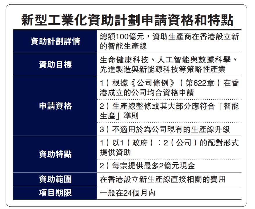 為進一步加快推進本港新型工業化,特區政府將推出100億元的新型工業加速計劃並開放申請,孫東表示,該計劃為生命健康科技、人工智能與數據科學、先進製造與新能源科技等策略性產業,提供更多資助,包括為新設智能生產設施提供資助,以1(政府):2(公司)的配對形式,提供最多2億元的現金支持。他補充,加速計劃為策略性產業的企業聘用研究人才提供額外資助,以鼓勵他們在香港進行研發或擴大其研發規模,以及讓他們聘用設立或營運新生產設施所需要的非本地人才。