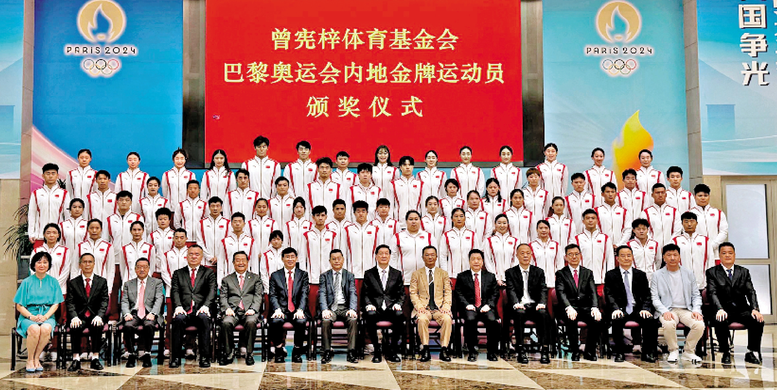 在頒獎儀式上,曾憲梓體育基金會理事長曾智明、曾憲梓體育基金會副理事長曾智雄向巴黎奧運會內地金牌運動員頒發了獎金支票,此次獎金總額達2800萬港元。曾智明指出,在第33屆夏季奧林匹克運動會上,中國體育代表團創造了多個歷史紀錄,不負海內外中華兒女眾望,以昂揚的鬥志、高超的技能,在巴黎奧運會上大放異彩,向全世界展現了中國力量,傳遞了中國精神,標誌着中國體育發展的新高度。