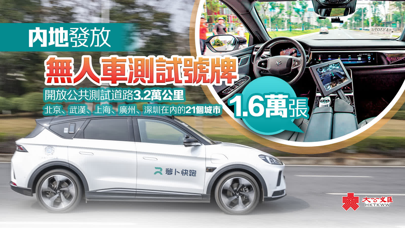 (香港文匯報記者 趙一存 北京報道)隨着中國科技的飛速發展,自動駕駛已成未來交通一大趨勢。中國公安部交通管理局局長王強27日在北京表示,中國無人駕駛、自動駕駛汽車產業當前正有序推進。截至目前,已累計發放自動駕駛汽車測試號牌1.6萬張,開放公共測試道路3.2萬公里,有力支撐自動駕駛技術驗證和迭代更新。另據了解,截至今年年初,中國已有21個城市發布了自動駕駛測試地方政策,60餘家企業獲得自動駕駛測試牌照。