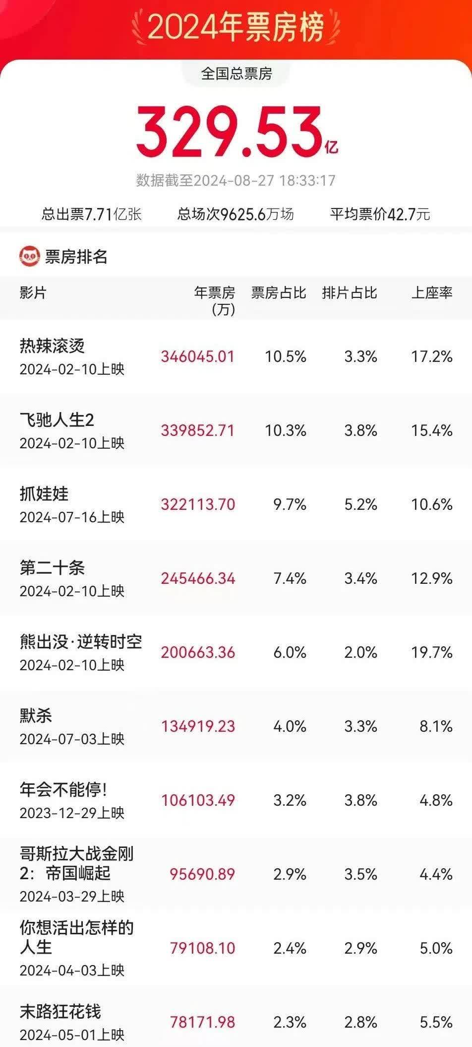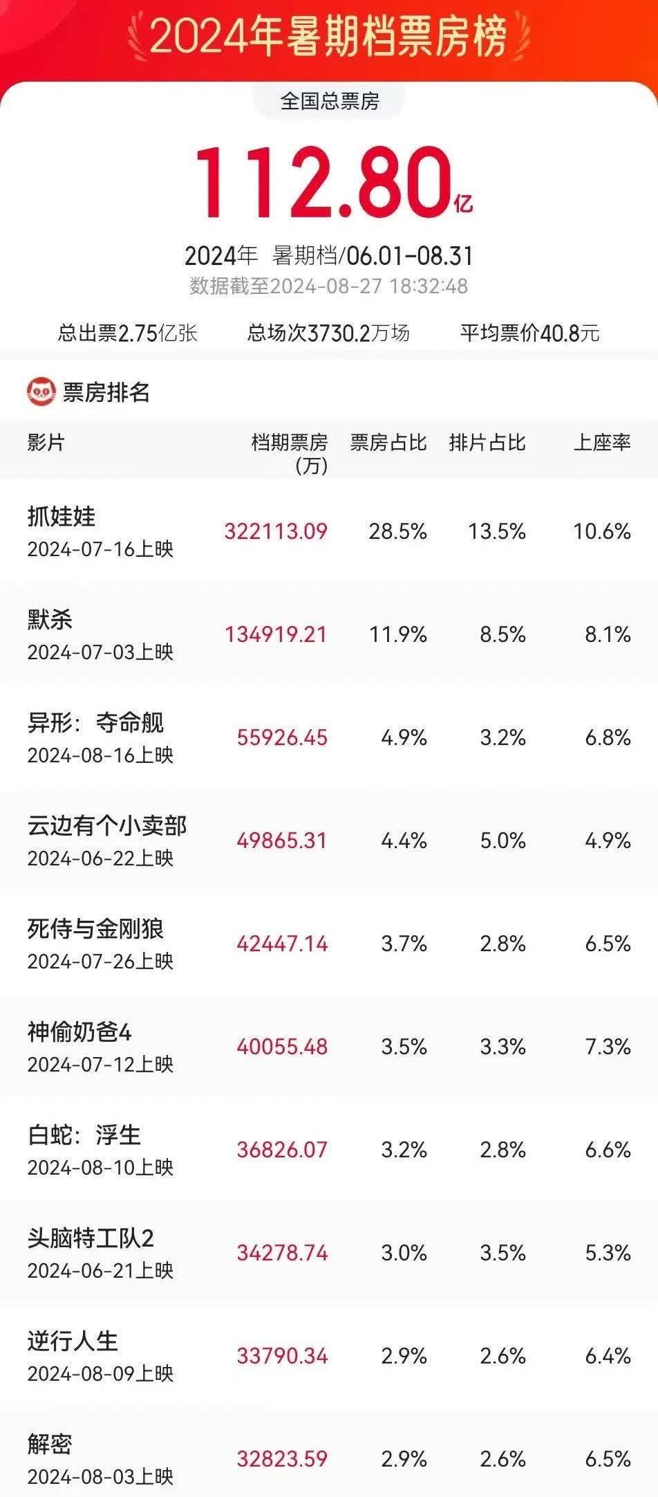 2024年暑期檔進入尾聲,據網絡平台實時數據,截至8月27日18時32分,暑期檔(6—8月)檔期總票房(含預售)已突破112億元(人民幣)。《抓娃娃》《默殺》《異形:奪命艦》暫列檔期票房榜前三位。