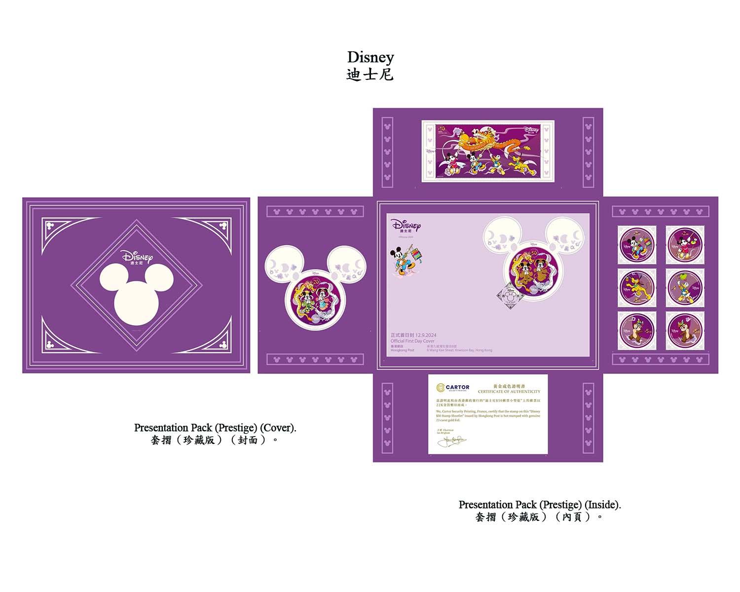 一套6枚不同面額的郵票展示6個穿戴傳統服飾的迪士尼經典人物。10元郵票小型張呈現米奇與好友一起舞動飛龍,20元及50元郵票小型張均特別採用米奇老鼠頭像形狀剪裁及立體壓印,而50元郵票小型張更加上22K金箔燙壓,極具收藏價值。另外,香港郵政亦特別推出嵌有一套6枚郵票的自動黏貼小全張,讓兒童及青少年體驗更簡單和便利的投寄過程,增添樂趣。